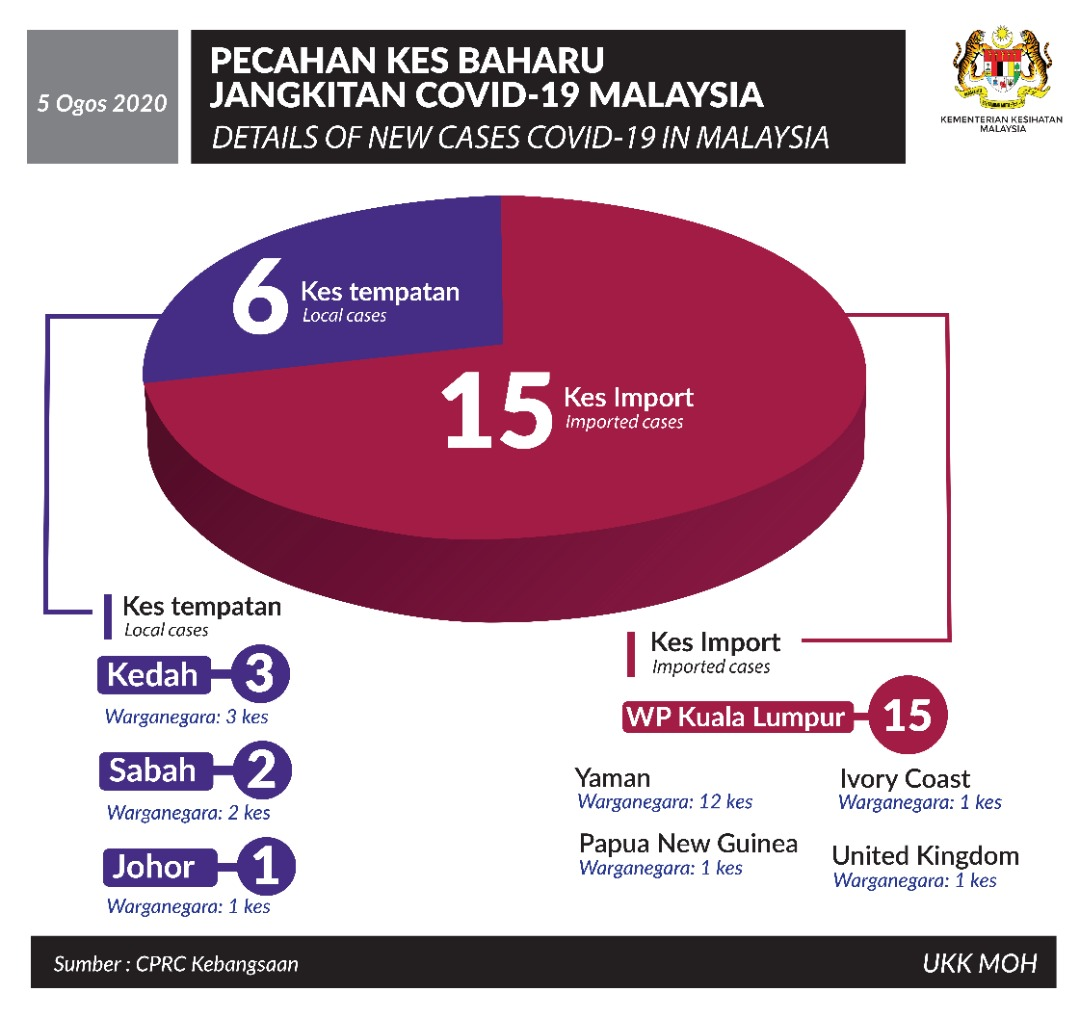 Statistik Pecahan Kes Baharu Jangkitan COVID-19 Malaysia 05/08/2020 Asrul Siaran Media 05 Ogos 2020 Jumlah paparan: 785 Rating: ( 0 Rating ) Sila beri kadar Undi 1 Undi 2 Undi 3 Undi 4 Undi 5 Facebook Twitter Seterusnya Seterusnya