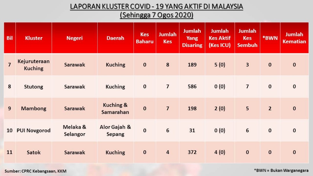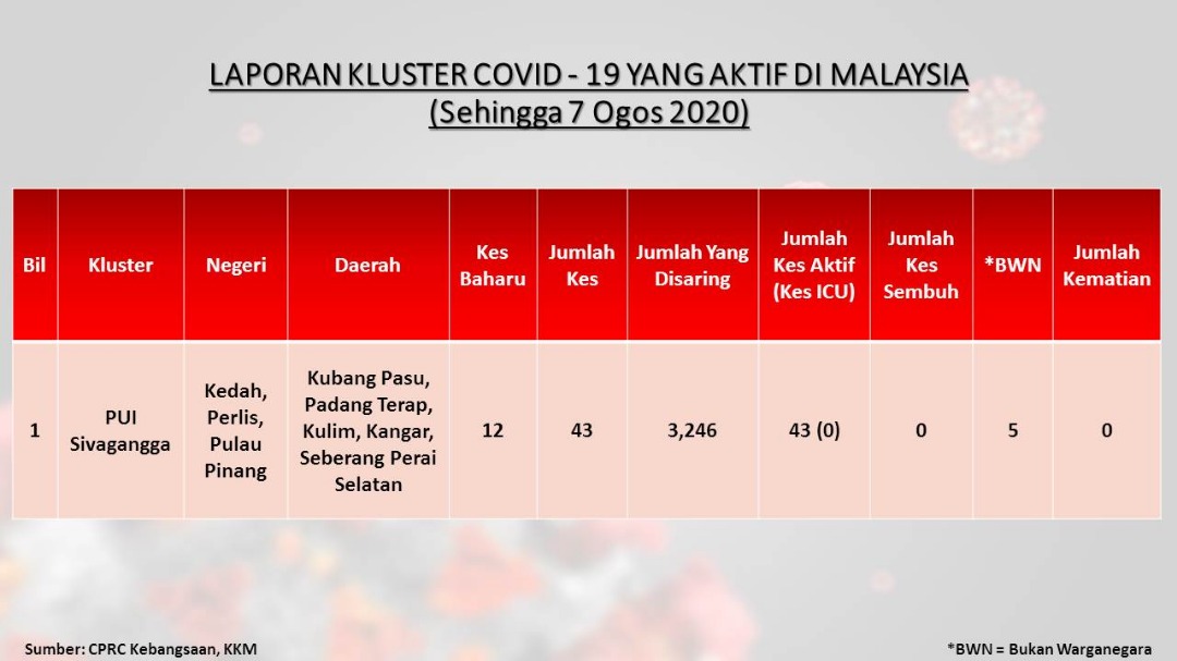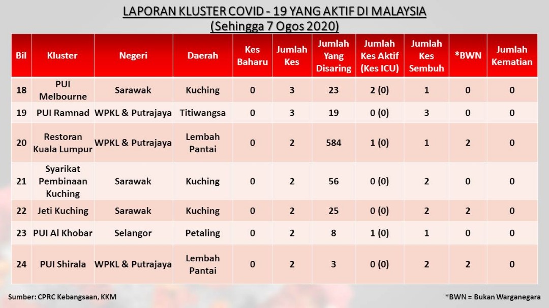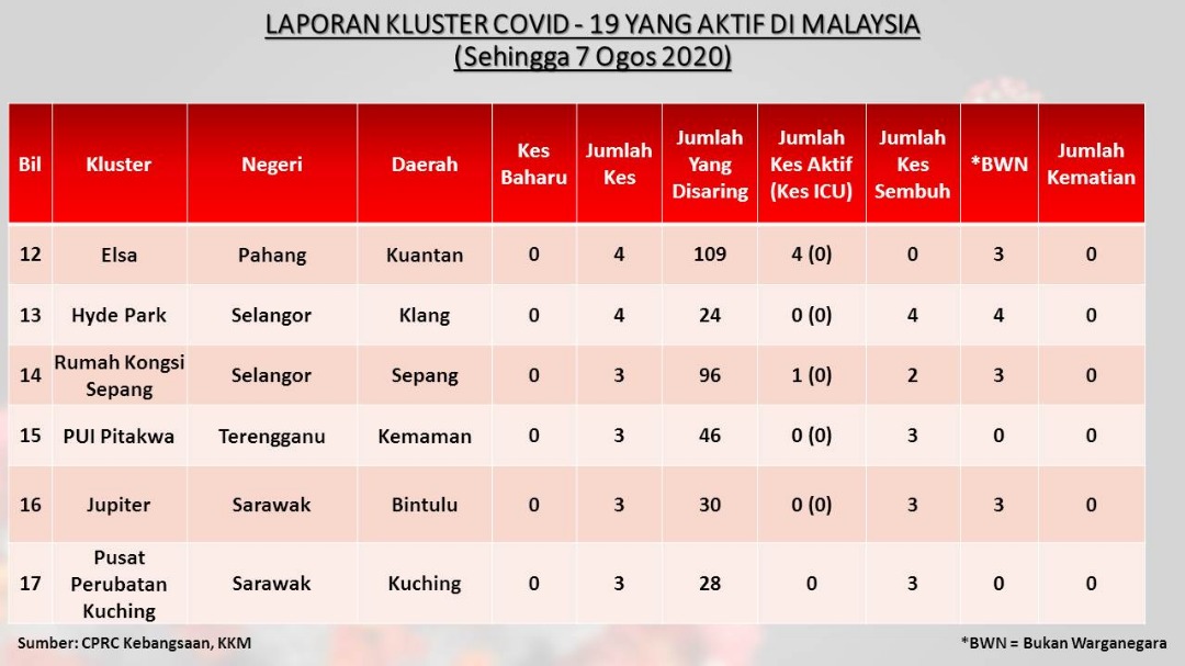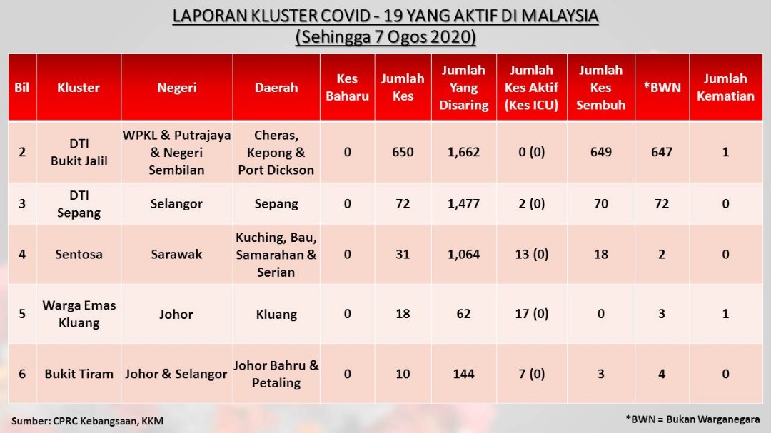 Laporan Kluster COVID-19 Aktif Di Malaysia 07/08/2020 Asrul Siaran Media 07 Ogos 2020 Jumlah paparan: 1002 Rating: ( 0 Rating ) Sila beri kadar Undi 1 Undi 2 Undi 3 Undi 4 Undi 5 Facebook Twitter Seterusnya Seterusnya