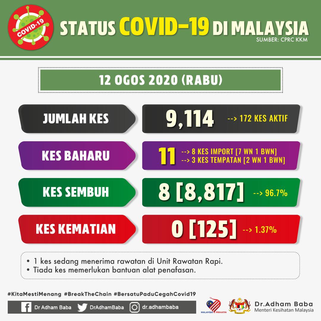 Status COVID-19 Di Malaysia 12/08/2020 Asrul Siaran Media 12 Ogos 2020 Jumlah paparan: 940 Rating: ( 0 Rating ) Sila beri kadar Undi 1 Undi 2 Undi 3 Undi 4 Undi 5 Facebook Twitter Seterusnya Seterusnya