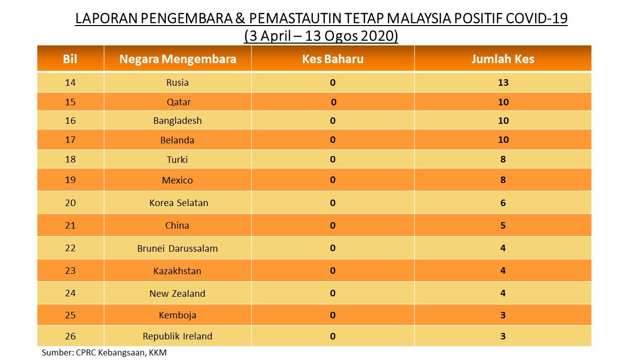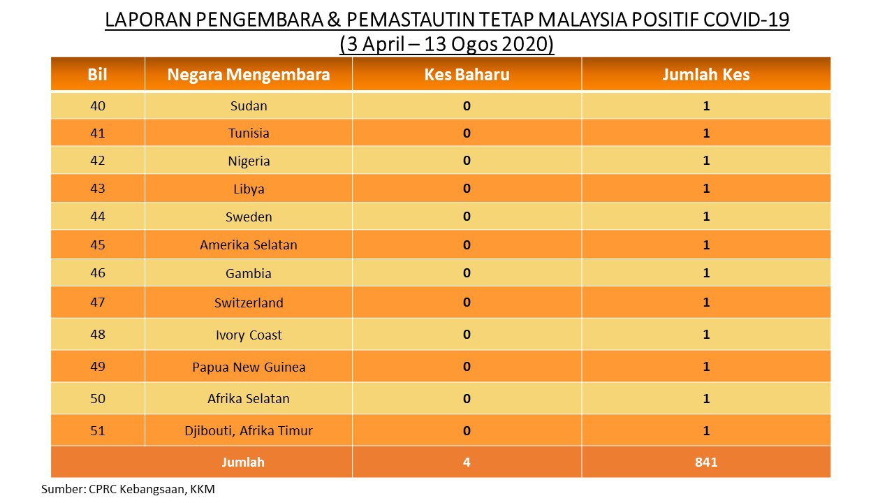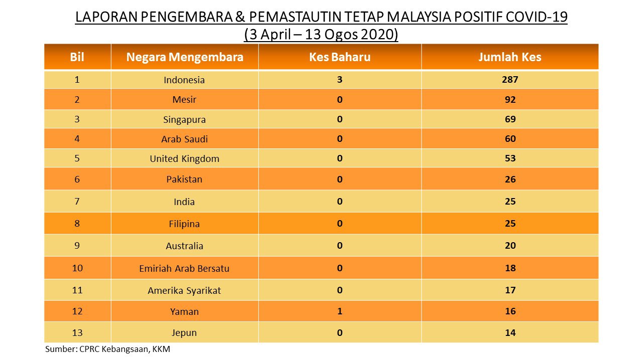 Laporan Pengembara & Pemastautin Tetap Malaysia Positif COVID-19 13/08/2020 Asrul Siaran Media 13 Ogos 2020 Jumlah paparan: 970 Rating: ( 0 Rating ) Sila beri kadar Undi 1 Undi 2 Undi 3 Undi 4 Undi 5 Facebook Twitter Seterusnya Seterusnya