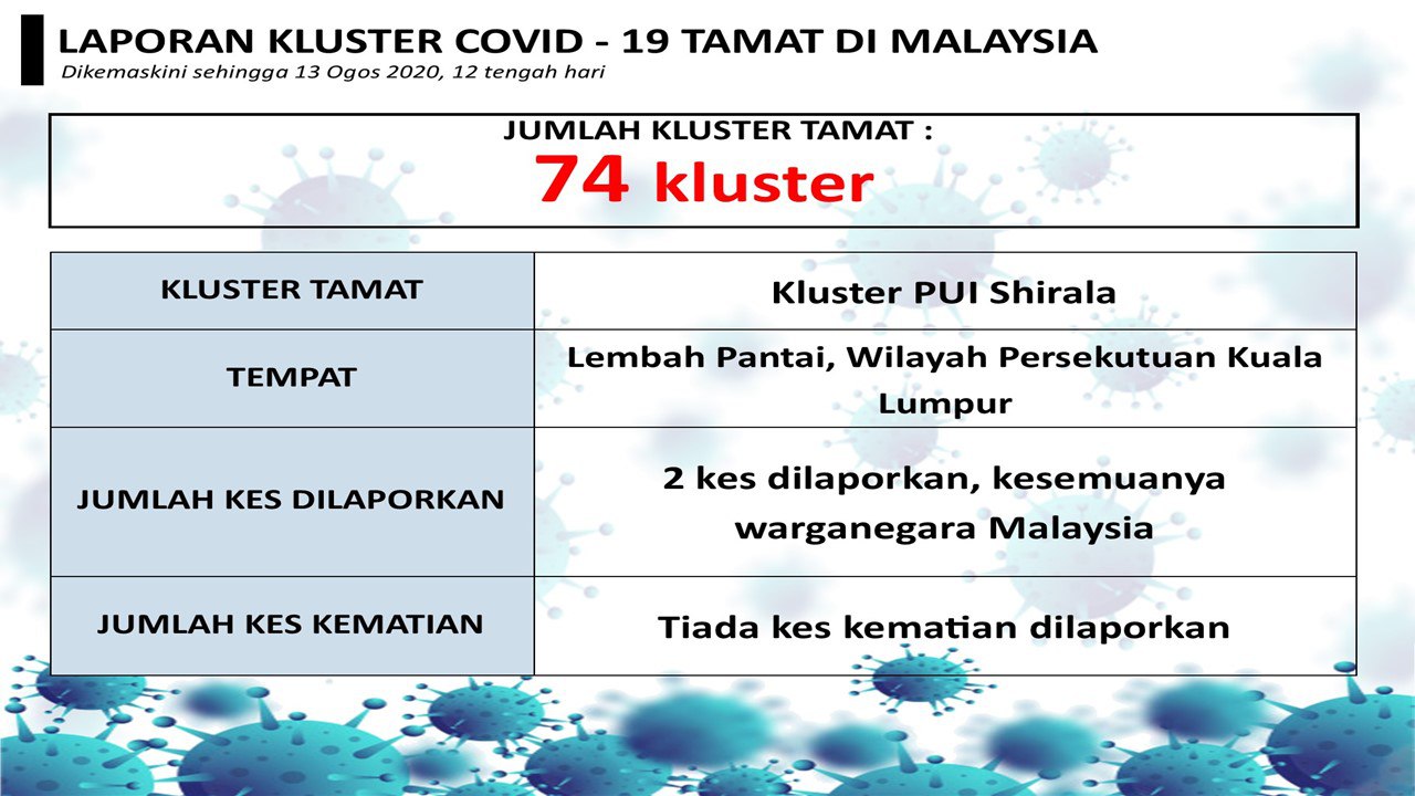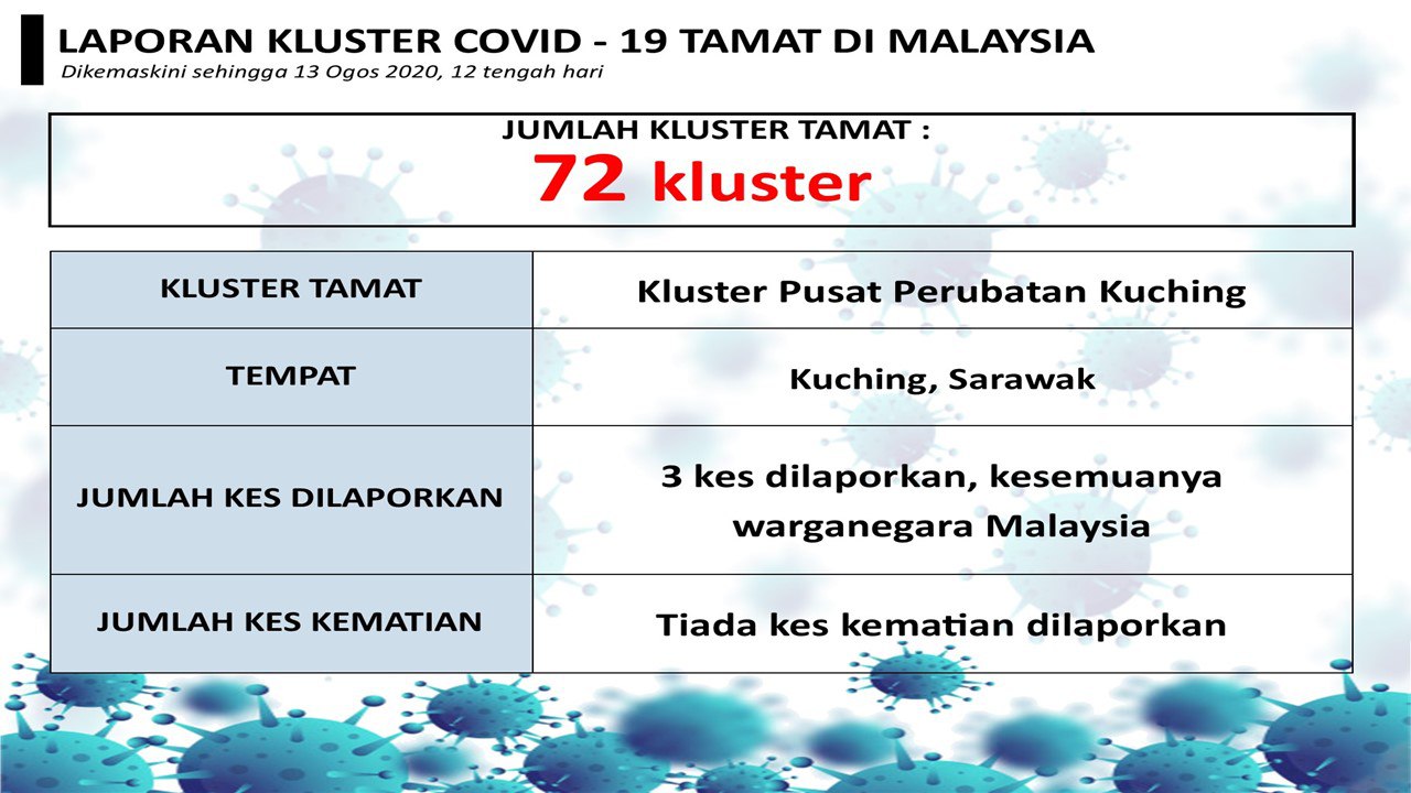 Laporan Kluster COVID-19 Tamat Di Malaysia 13/08/2020 1200 PM Asrul Siaran Media 13 Ogos 2020 Jumlah paparan: 758 Rating: ( 0 Rating ) Sila beri kadar Undi 1 Undi 2 Undi 3 Undi 4 Undi 5 Facebook Twitter Seterusnya Seterusnya