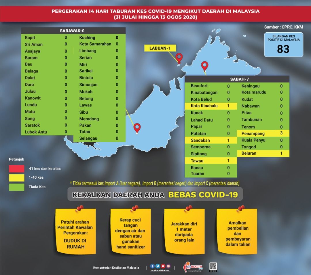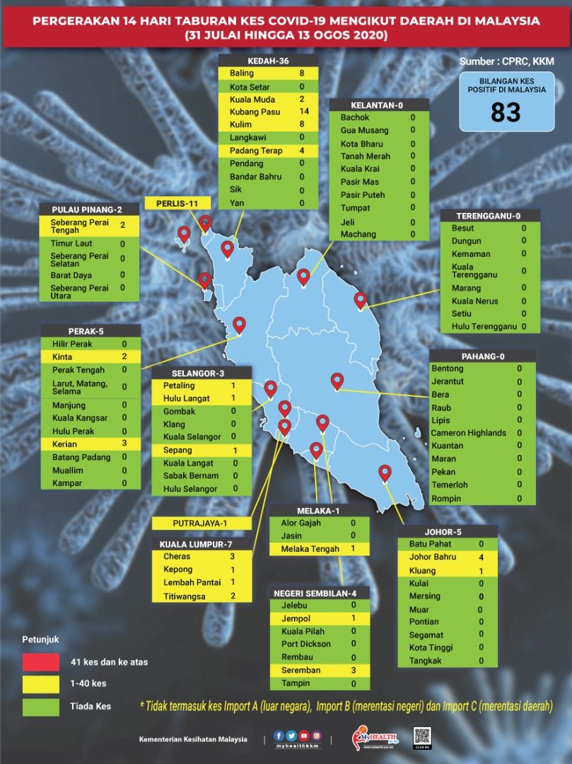 Pergerakan 14 Hari Taburan Kes COVID-19 Mengikut Daerah Di Malaysia 13/08/2020 Asrul Siaran Media 13 Ogos 2020 Jumlah paparan: 934 Rating: ( 0 Rating ) Sila beri kadar Undi 1 Undi 2 Undi 3 Undi 4 Undi 5 Facebook Twitter Seterusnya Seterusnya