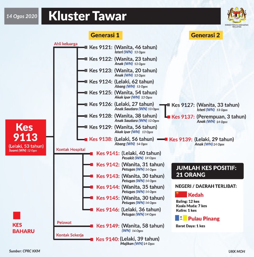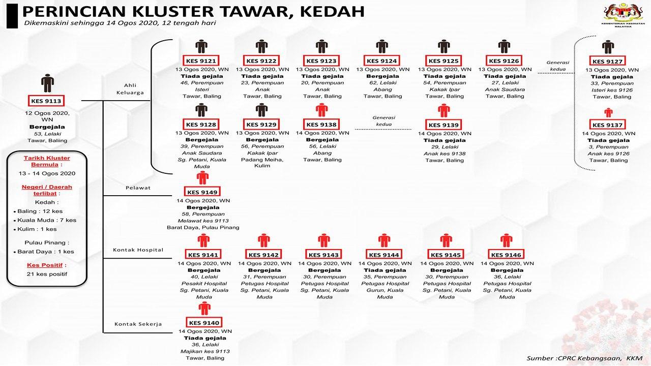 Perincian Kluster Tawar,Kedah 14/08/2020 Asrul Siaran Media 14 Ogos 2020 Jumlah paparan: 1106 Rating: ( 0 Rating ) Sila beri kadar Undi 1 Undi 2 Undi 3 Undi 4 Undi 5 Facebook Twitter Seterusnya Seterusnya