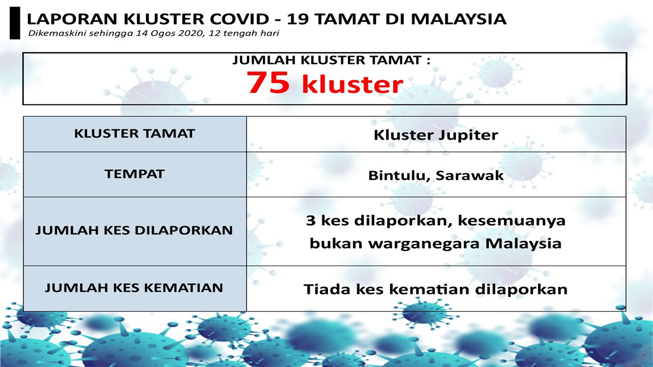 Laporan Kluster COVID-19 Tamat Di Malaysia 14/08/2020 1200 PM Asrul Siaran Media 14 Ogos 2020 Jumlah paparan: 929 Rating: ( 0 Rating ) Sila beri kadar Undi 1 Undi 2 Undi 3 Undi 4 Undi 5 Facebook Twitter Seterusnya Seterusnya