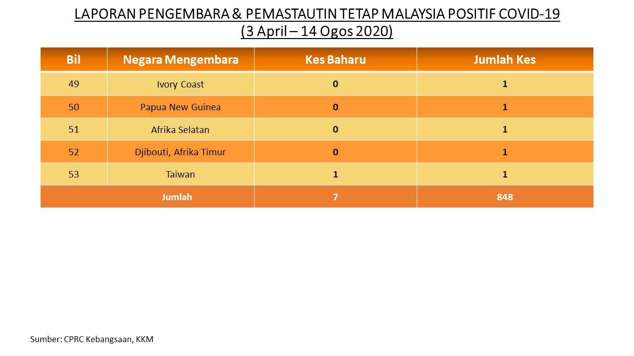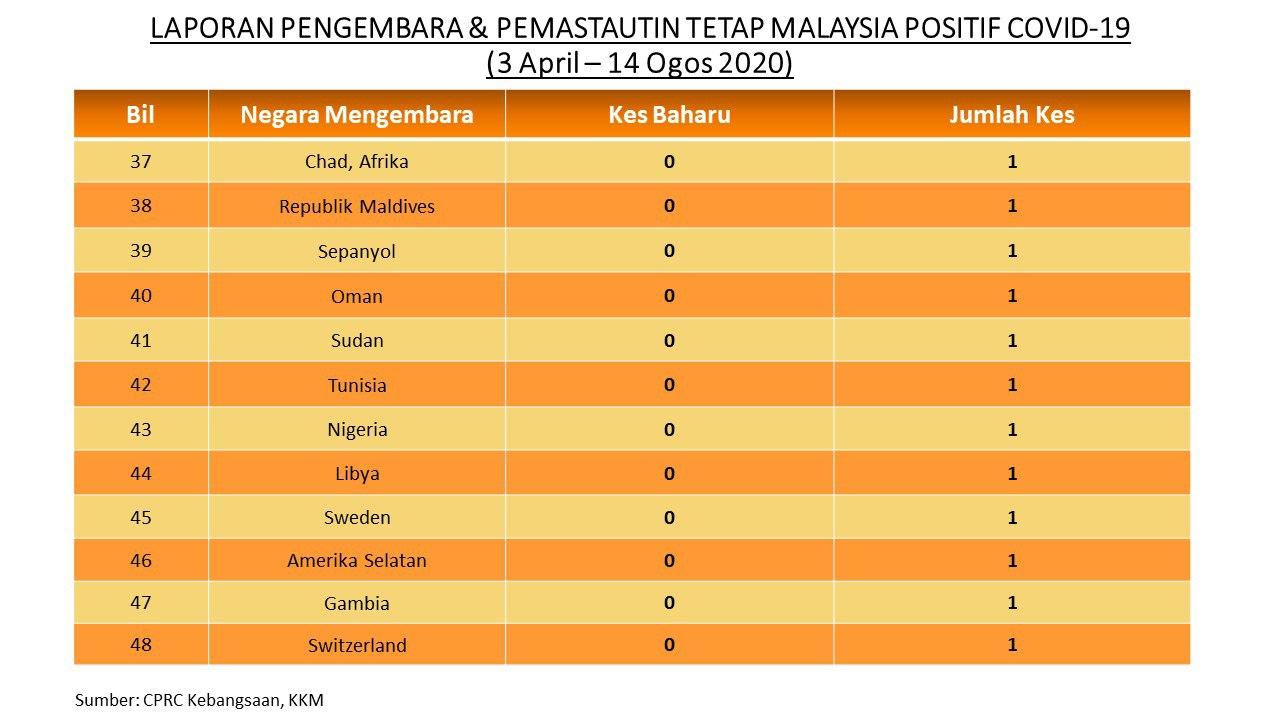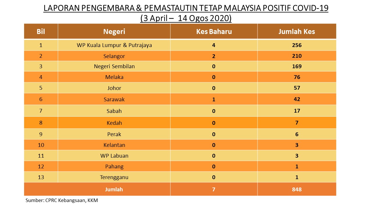 Laporan Pengembara & Pemastautin Tetap Malaysia Positif COVID-19 14/08/2020 Asrul Siaran Media 14 Ogos 2020 Jumlah paparan: 660 Rating: ( 0 Rating ) Sila beri kadar Undi 1 Undi 2 Undi 3 Undi 4 Undi 5 Facebook Twitter Seterusnya Seterusnya