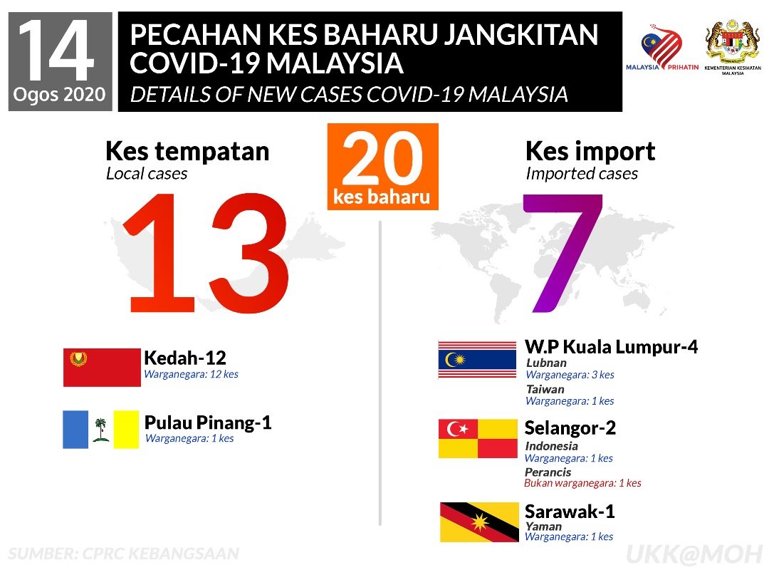 Statistik Pecahan Kes Baharu Jangkitan COVID-19 Malaysia 14/08/2020 Asrul Siaran Media 14 Ogos 2020 Jumlah paparan: 945 Rating: ( 0 Rating ) Sila beri kadar Undi 1 Undi 2 Undi 3 Undi 4 Undi 5 Facebook Twitter Seterusnya Seterusnya