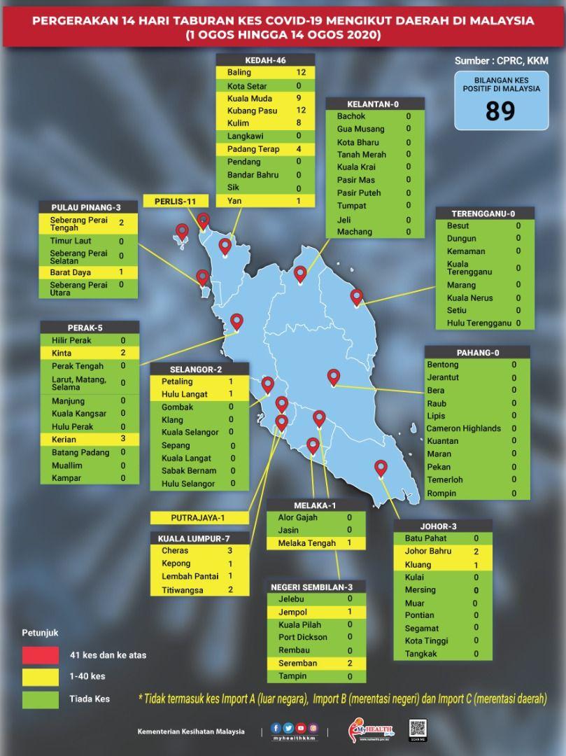 Pergerakan 14 Hari Taburan Kes COVID-19 Mengikut Daerah Di Malaysia 14/08/2020 Asrul Siaran Media 14 Ogos 2020 Jumlah paparan: 801 Rating: ( 0 Rating ) Sila beri kadar Undi 1 Undi 2 Undi 3 Undi 4 Undi 5 Facebook Twitter Seterusnya Seterusnya