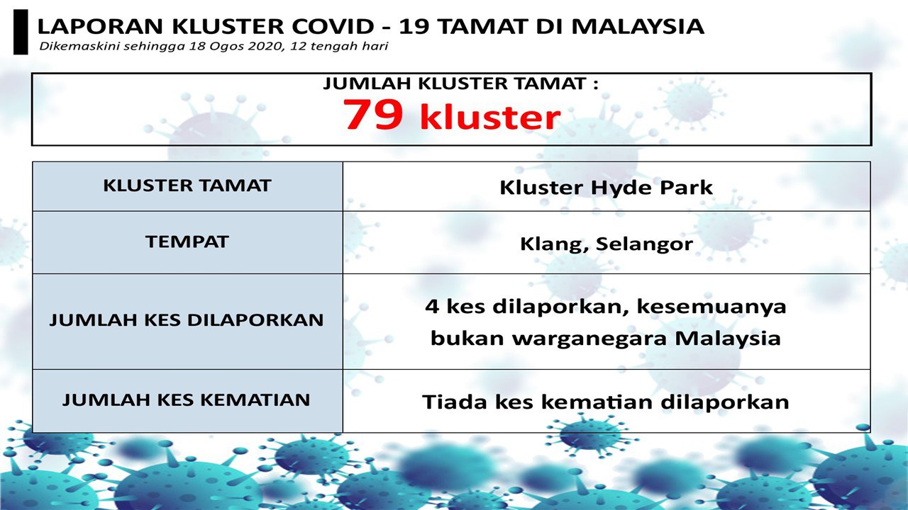 Laporan Kluster COVID-19 Tamat Di Malaysia 18/08/2020 1200 PM Aiman Siaran Media 18 Ogos 2020 Jumlah paparan: 693 Rating: ( 0 Rating ) Sila beri kadar Undi 1 Undi 2 Undi 3 Undi 4 Undi 5 Facebook Twitter Seterusnya Seterusnya