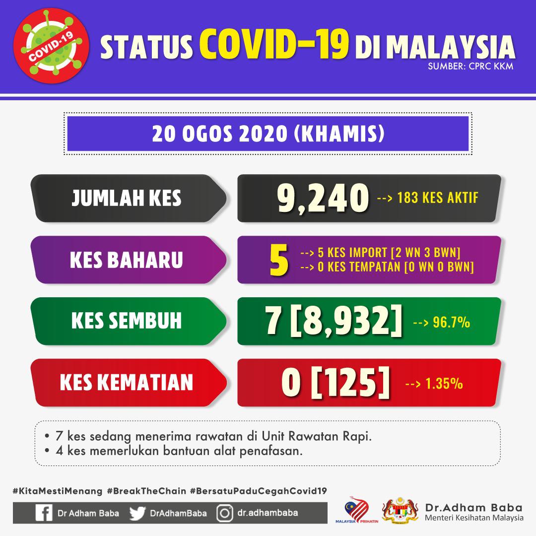 Status COVID-19 Di Malaysia 20/08/2020 Asrul Siaran Media 20 Ogos 2020 Jumlah paparan: 683 Rating: ( 0 Rating ) Sila beri kadar Undi 1 Undi 2 Undi 3 Undi 4 Undi 5 Facebook Twitter Seterusnya Seterusnya