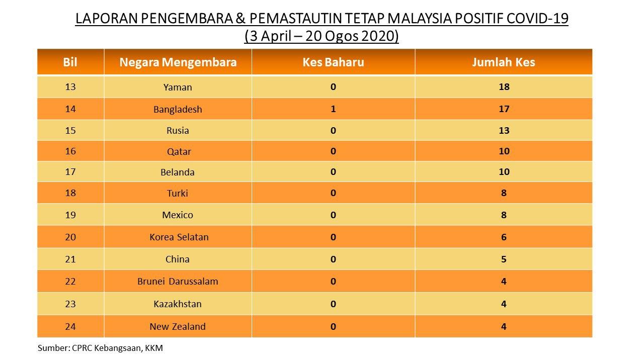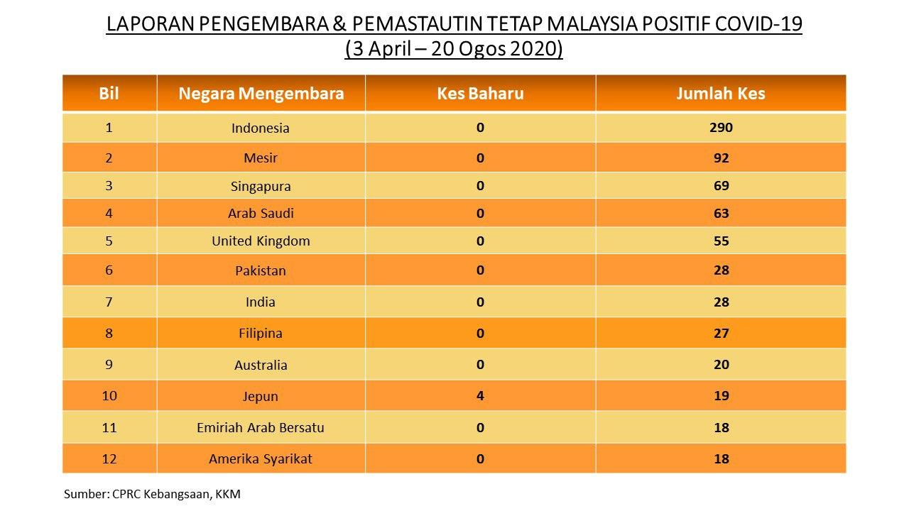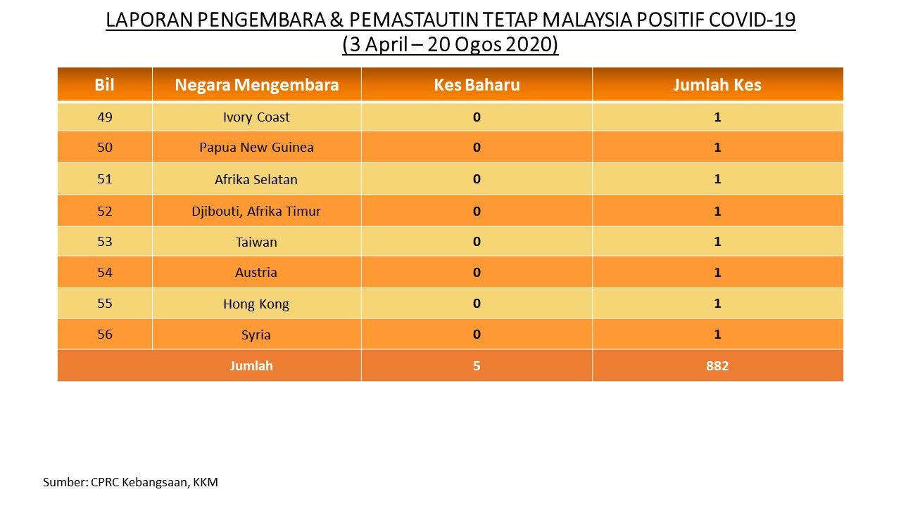 Laporan Pengembara & Pemastautin Tetap Malaysia Positif COVID-19 20/08/2020 Asrul Siaran Media 20 Ogos 2020 Jumlah paparan: 979 Rating: ( 0 Rating ) Sila beri kadar Undi 1 Undi 2 Undi 3 Undi 4 Undi 5 Facebook Twitter Seterusnya Seterusnya