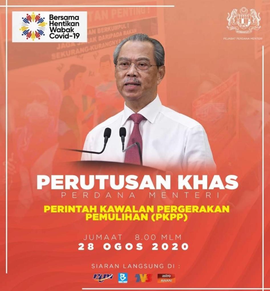 Perutusan Khas YAB Perdana Menteri Malaysia :- Perintah Kawalan Pergerakan Pemulihan (PKPP) Asrul Siaran Media 28 Ogos 2020 Jumlah paparan: 1040 Rating: ( 0 Rating ) Sila beri kadar Undi 1 Undi 2 Undi 3 Undi 4 Undi 5 Facebook Twitter Seterusnya Seterusnya