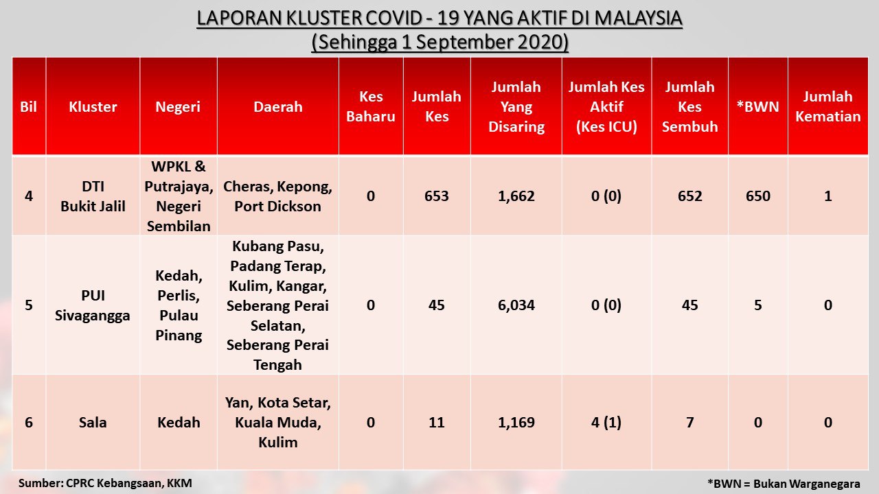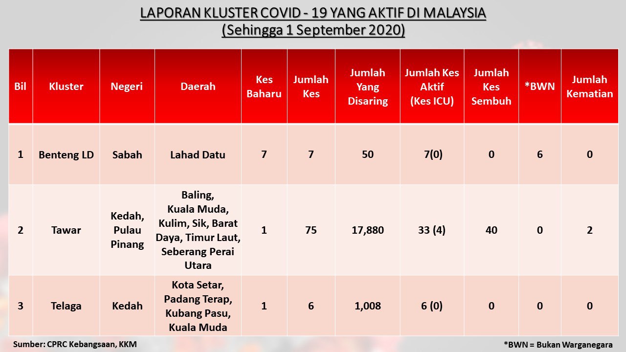 Laporan Kluster COVID-19 Aktif Di Malaysia 01/09/2020 Aiman Siaran Media 01 September 2020 Jumlah paparan: 983 Rating: ( 0 Rating ) Sila beri kadar Undi 1 Undi 2 Undi 3 Undi 4 Undi 5 Facebook Twitter Seterusnya Seterusnya