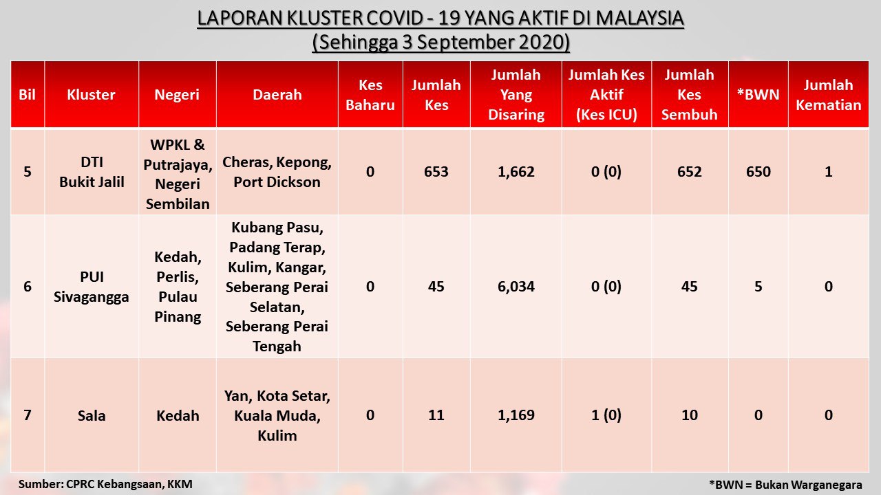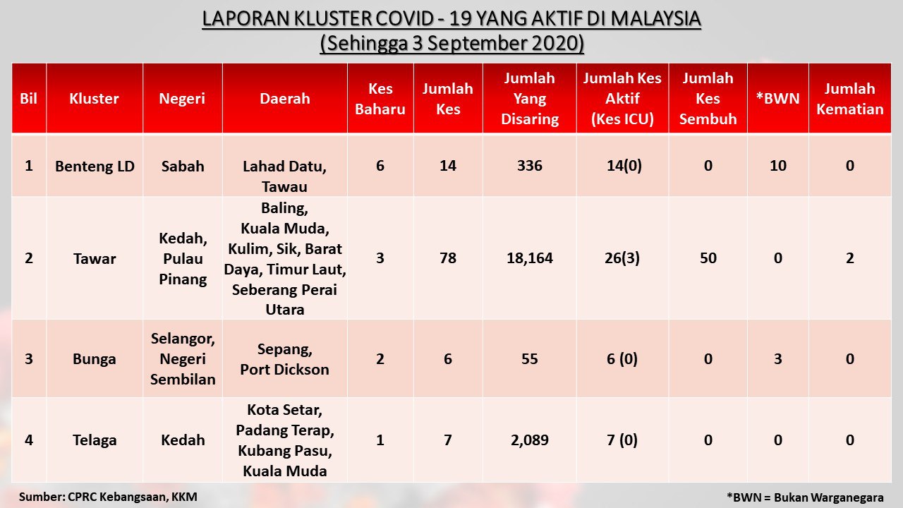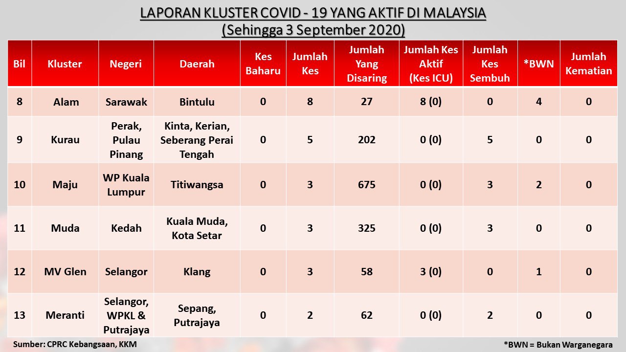 Laporan Kluster COVID-19 Aktif Di Malaysia 03/09/2020 Aiman Siaran Media 03 September 2020 Jumlah paparan: 717 Rating: ( 0 Rating ) Sila beri kadar Undi 1 Undi 2 Undi 3 Undi 4 Undi 5 Facebook Twitter Seterusnya Seterusnya