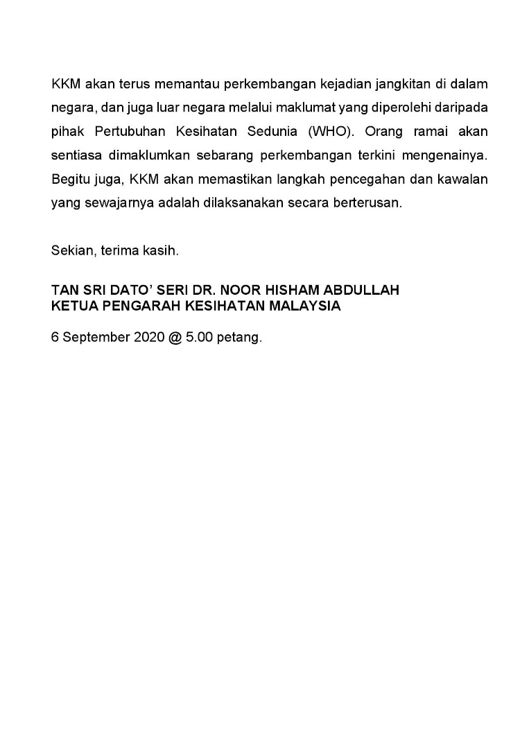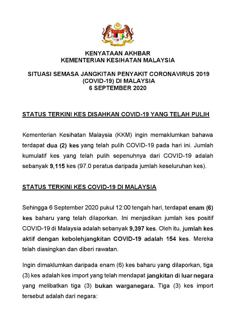 Kenyataan Akhbar KP KKM 06/09/2020 0500 PM Aiman Siaran Media 06 September 2020 Jumlah paparan: 1024 Rating: ( 0 Rating ) Sila beri kadar Undi 1 Undi 2 Undi 3 Undi 4 Undi 5 Facebook Twitter Seterusnya Seterusnya