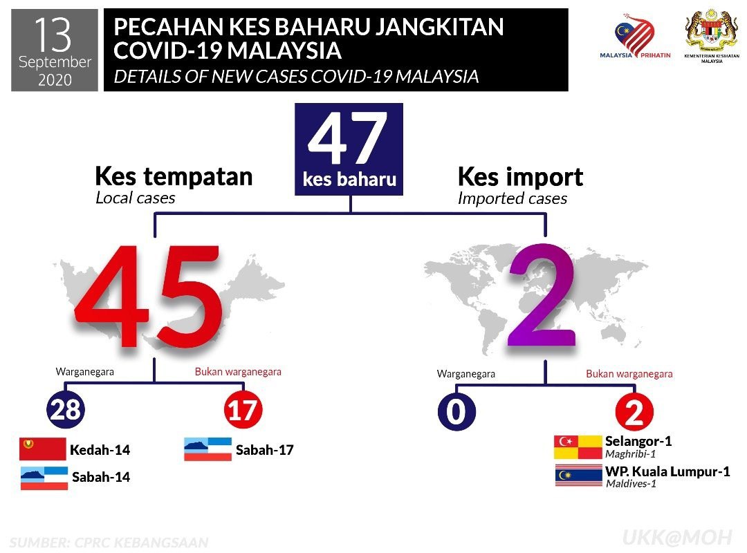 Statistik Pecahan Kes Baharu Jangkitan COVID-19 Malaysia 13/09/2020 Aiman Siaran Media 13 September 2020 Jumlah paparan: 625 Rating: ( 0 Rating ) Sila beri kadar Undi 1 Undi 2 Undi 3 Undi 4 Undi 5 Lihat / Muat Turun JPG Facebook Twitter Seterusnya Seterusnya