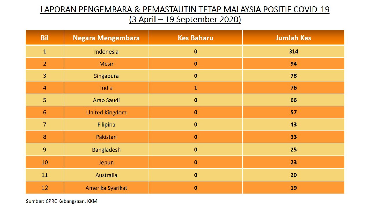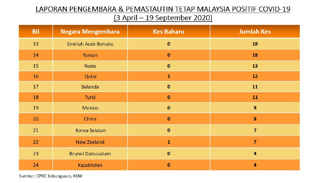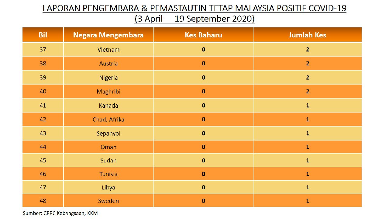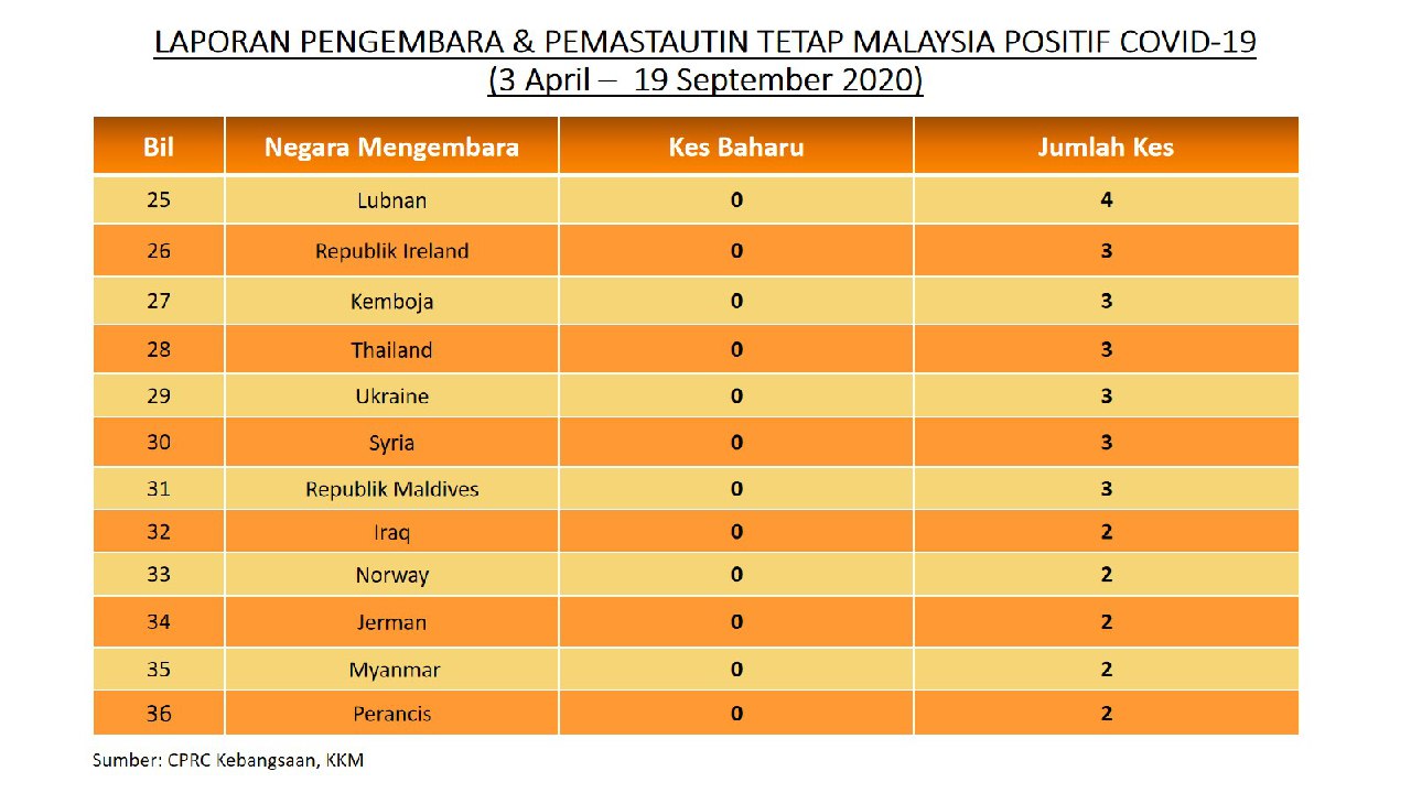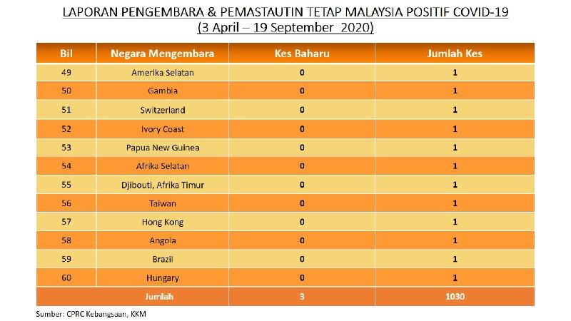 Laporan Pengembara & Pemastautin Tetap Malaysia Positif COVID-19 19/09/2020 Aiman Siaran Media 19 September 2020 Jumlah paparan: 1036 Rating: ( 0 Rating ) Sila beri kadar Undi 1 Undi 2 Undi 3 Undi 4 Undi 5 Facebook Twitter Seterusnya Seterusnya