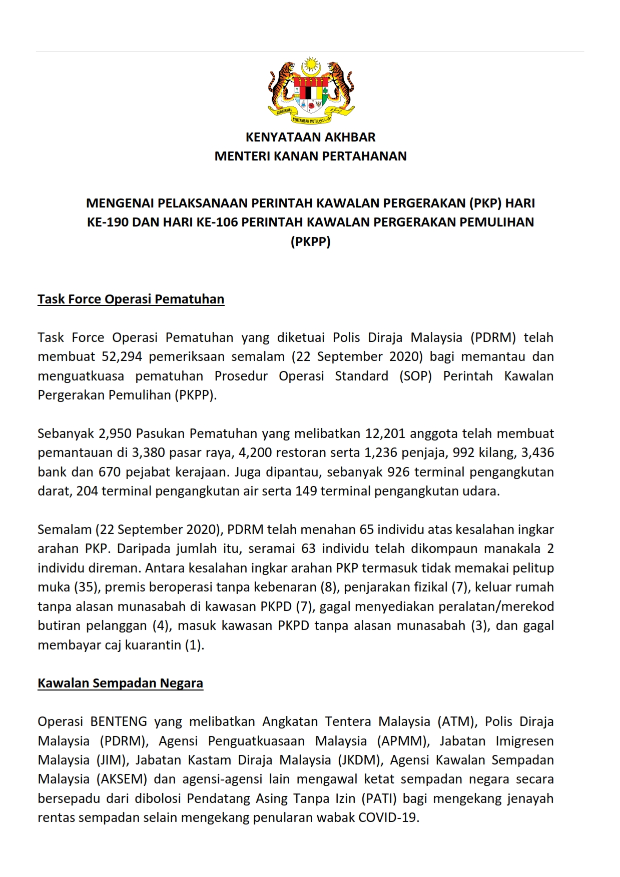 Kenyataan Akhbar Menteri Kanan Pertahanan 23/09/2020 0200 PM Aiman Siaran Media 23 September 2020 Jumlah paparan: 793 Rating: ( 0 Rating ) Sila beri kadar Undi 1 Undi 2 Undi 3 Undi 4 Undi 5 /bencana2/images/ndcc/documents/covid19/siaranmedia202009/SIARAN_MEDIA_KKM_20200923_.03pdf Facebook Twitter Seterusnya Seterusnya