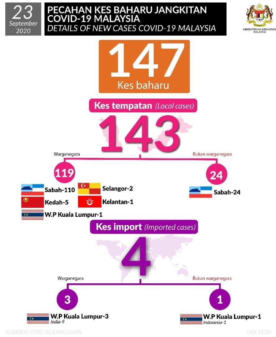Statistik Pecahan Kes Baharu Jangkitan COVID-19 Malaysia 23/09/2020 Aiman Siaran Media 23 September 2020 Jumlah paparan: 963 Rating: ( 0 Rating ) Sila beri kadar Undi 1 Undi 2 Undi 3 Undi 4 Undi 5 Lihat / Muat Turun JPG Facebook Twitter Seterusnya Seterusnya