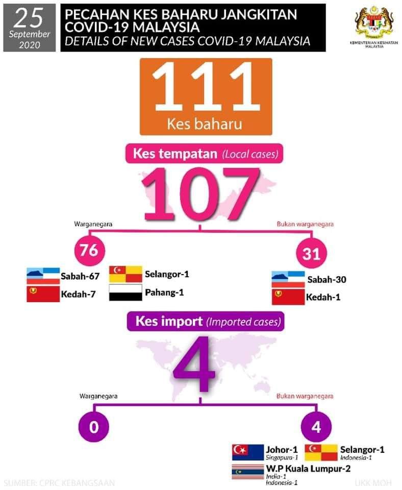 Statistik Pecahan Kes Baharu Jangkitan COVID-19 Malaysia 25/09/2020 Aiman Siaran Media 25 September 2020 Jumlah paparan: 841 Rating: ( 0 Rating ) Sila beri kadar Undi 1 Undi 2 Undi 3 Undi 4 Undi 5 Lihat / Muat Turun JPG Facebook Twitter Seterusnya Seterusnya
