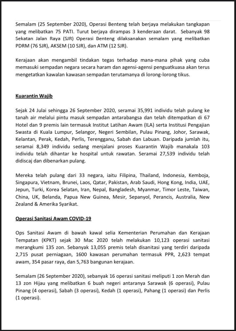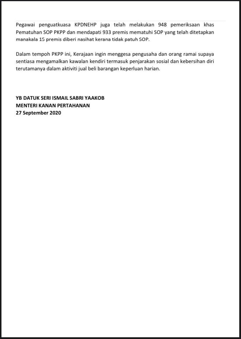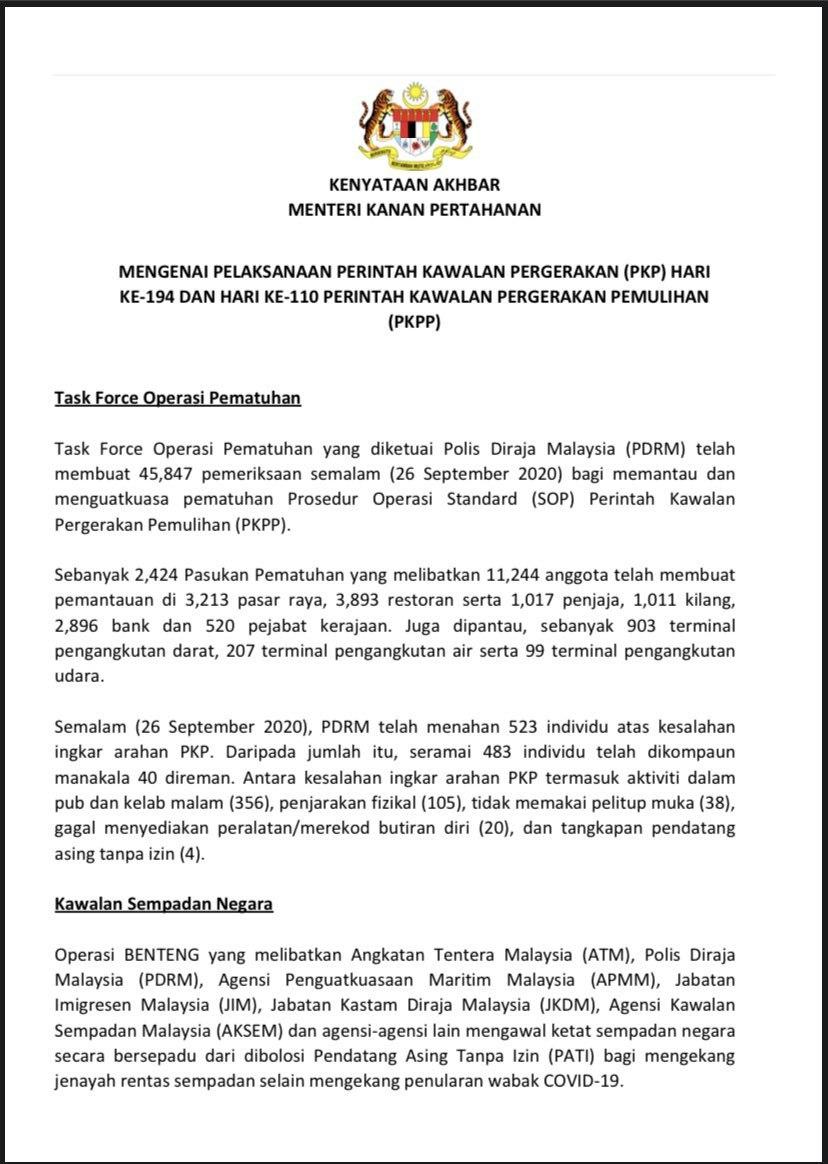 Kenyataan Akhbar Menteri Kanan Pertahanan 27/09/2020 0200 PM Aiman Siaran Media 27 September 2020 Jumlah paparan: 804 Rating: ( 0 Rating ) Sila beri kadar Undi 1 Undi 2 Undi 3 Undi 4 Undi 5 /bencana2/images/ndcc/documents/covid19/siaranmedia202009/SIARAN_MEDIA_KKM_20200927_.03pdf Facebook Twitter Seterusnya Seterusnya