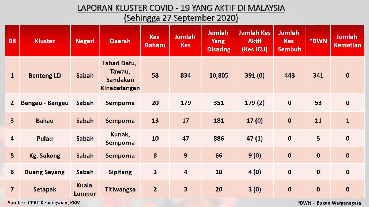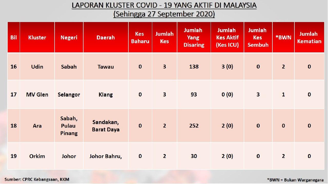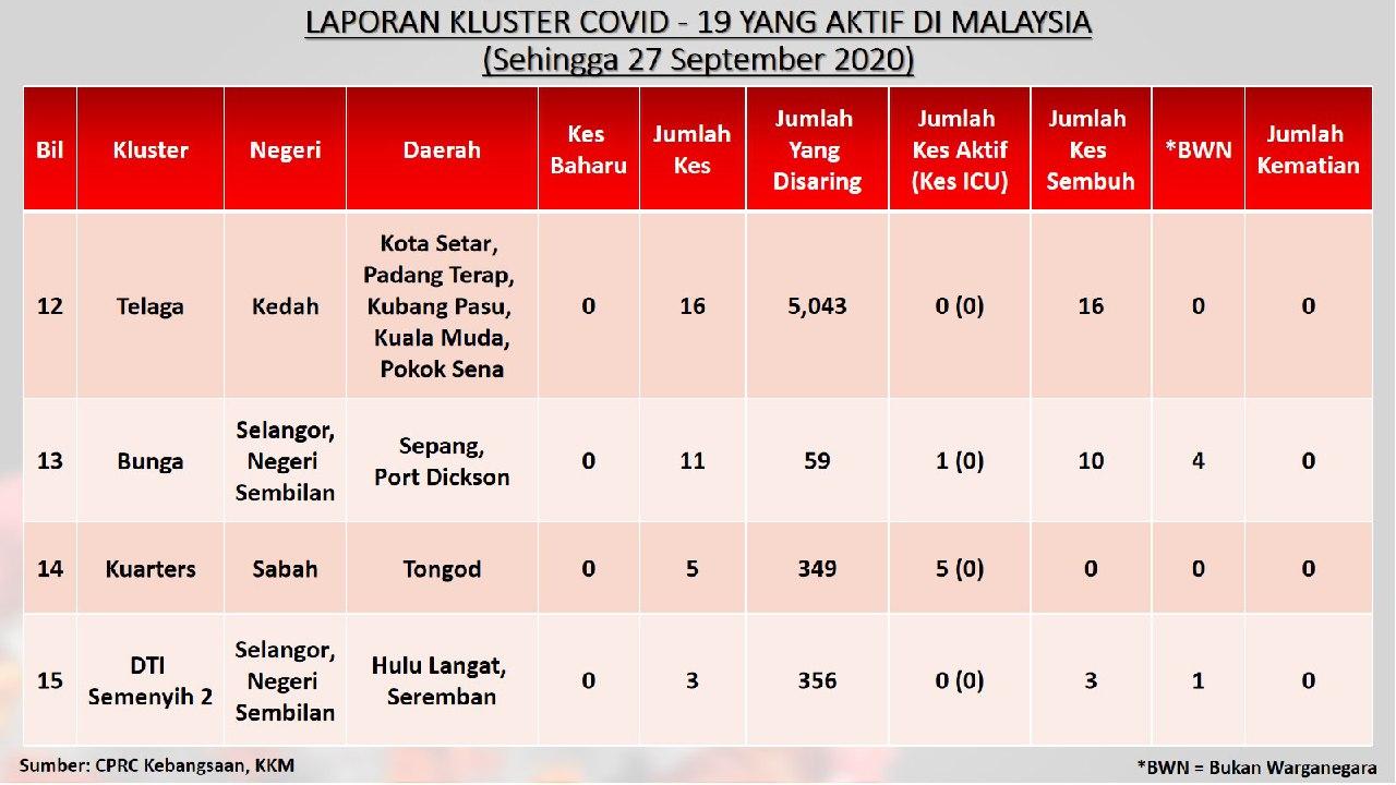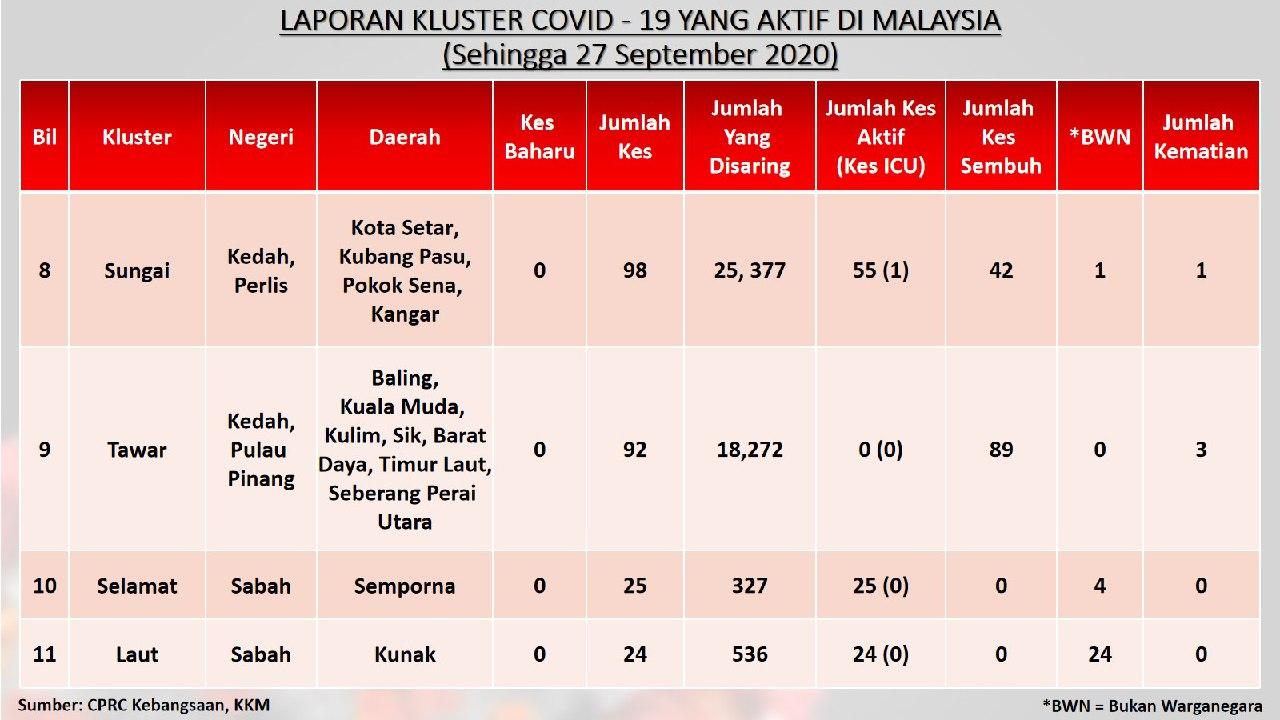 Laporan Kluster COVID-19 Aktif Di Malaysia 27/09/2020 Aiman Siaran Media 27 September 2020 Jumlah paparan: 750 Rating: ( 0 Rating ) Sila beri kadar Undi 1 Undi 2 Undi 3 Undi 4 Undi 5 Lihat / Muat Turun JPG 1 Lihat / Muat Turun JPG 2 Lihat / Muat Turun JPG 3 Facebook Twitter Seterusnya Seterusnya