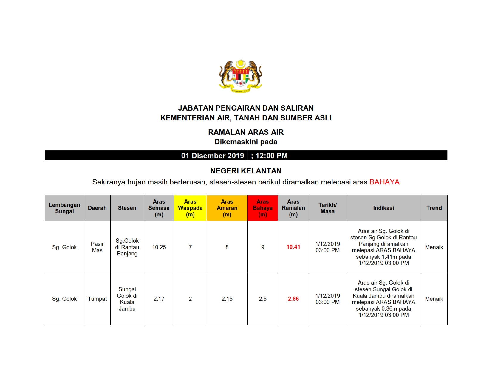 Ramalan Aras Air Kelantan 01/12/2019 1200 PM Aiman Cuaca 01 Disember 2019 Jumlah paparan: 1098 Rating: ( 0 Rating ) Sila beri kadar Undi 1 Undi 2 Undi 3 Undi 4 Undi 5 Lihat / Muat Turun PDF Muat Turun JPG 1 Muat Turun JPG 2 Facebook Twitter Seterusnya Seterusnya