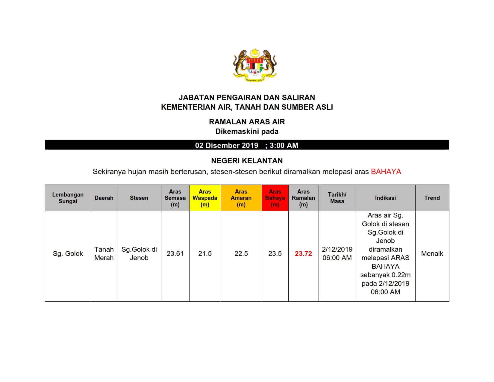 Ramalan Aras Air Kelantan 02/12/2019 0300 AM Asrul Cuaca 02 Disember 2019 Jumlah paparan: 985 Rating: ( 0 Rating ) Sila beri kadar Undi 1 Undi 2 Undi 3 Undi 4 Undi 5 Lihat / Muat Turun PDF Muat Turun JPG 1 Muat Turun JPG 2 Facebook Twitter Seterusnya Seterusnya