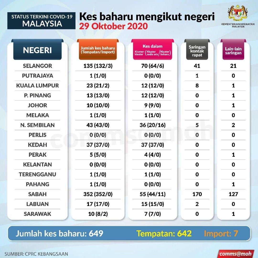 Status Terkini Kes Baharu Jangkitan COVID-19 Mengikut Negeri Di Malaysia 29/10/2020 Aiman Siaran Media 29 Oktober 2020 Jumlah paparan: 543 Rating: ( 0 Rating ) Sila beri kadar Undi 1 Undi 2 Undi 3 Undi 4 Undi 5 Lihat / Muat Turun JPG Facebook Twitter Seterusnya Seterusnya