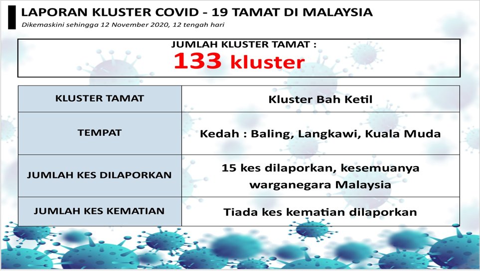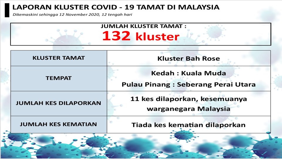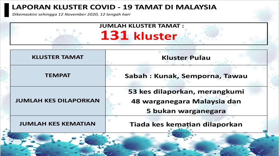 Laporan Kluster COVID-19 Tamat Di Malaysia 12/11/2020 1200 PM Aiman Siaran Media 12 November 2020 Jumlah paparan: 539 Rating: ( 0 Rating ) Sila beri kadar Undi 1 Undi 2 Undi 3 Undi 4 Undi 5 Facebook Twitter Seterusnya Seterusnya