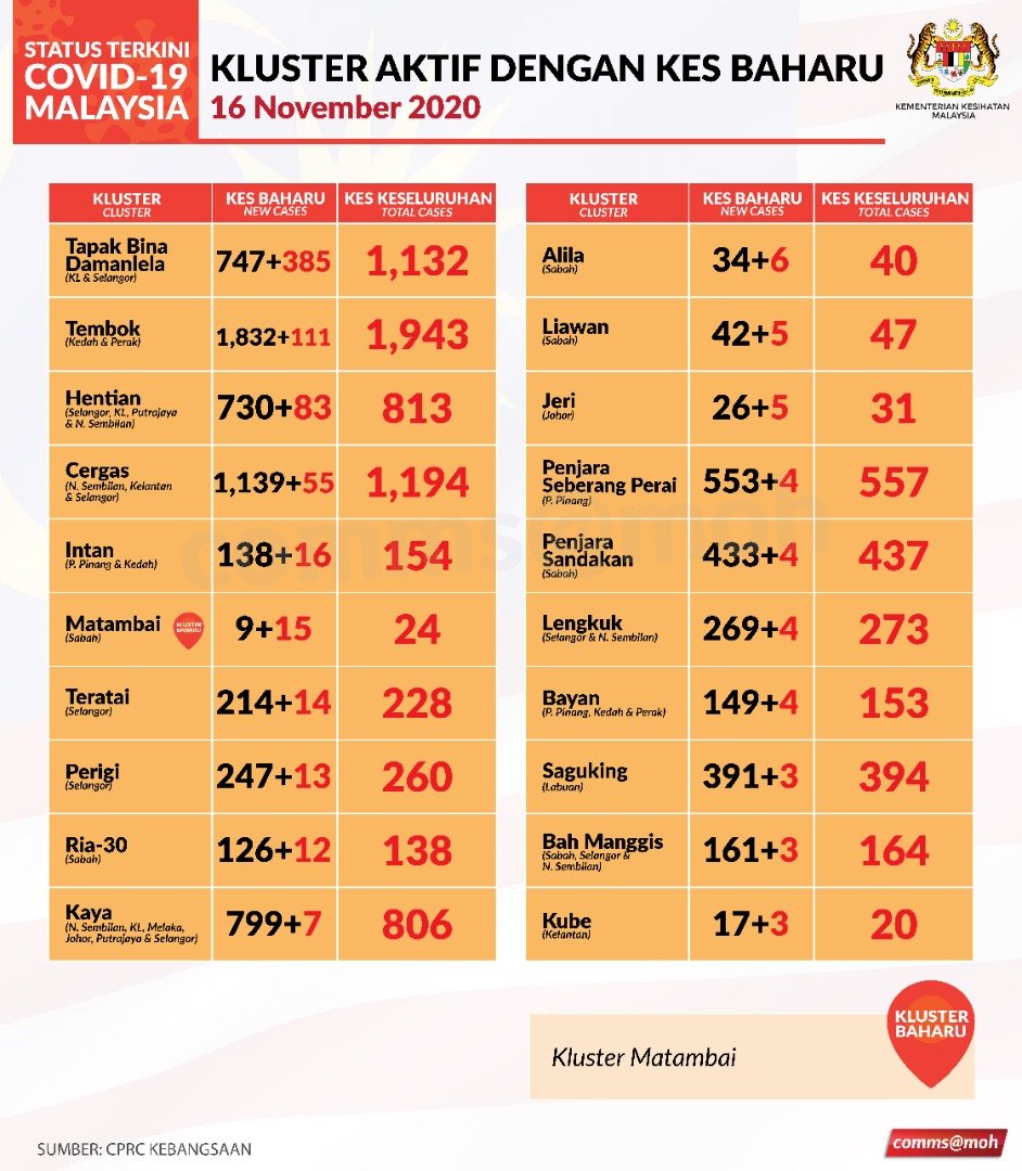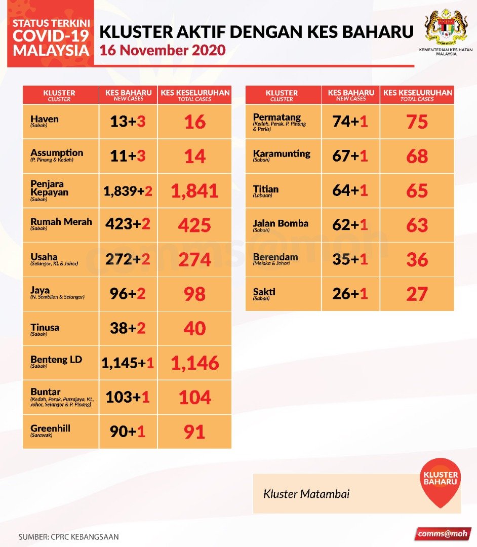 Situasi Terkini Kluster Aktif Dengan Kes Baharu Covid-19 16/11/2020 Aiman Siaran Media 16 November 2020 Jumlah paparan: 621 Rating: ( 0 Rating ) Sila beri kadar Undi 1 Undi 2 Undi 3 Undi 4 Undi 5 Lihat / Muat Turun JPG 1 Lihat / Muat Turun JPG 2 Facebook Twitter Seterusnya Seterusnya
