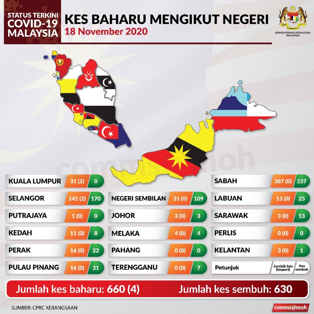 Status Terkini Kes Baharu Jangkitan COVID-19 Mengikut Negeri Di Malaysia 18/11/2020 Aiman Siaran Media 18 November 2020 Jumlah paparan: 825 Rating: ( 0 Rating ) Sila beri kadar Undi 1 Undi 2 Undi 3 Undi 4 Undi 5 Lihat / Muat Turun JPG Facebook Twitter Seterusnya Seterusnya