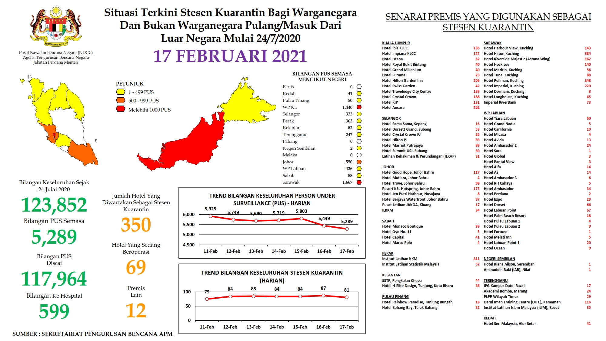 Situasi Terkini Stesen Kuarantin Bagi Warganegara Dan Bukan Warganegara Pulang/Masuk Dari Luar Negara 17/02/2021 Aiman Siaran Media 17 Februari 2021 Jumlah paparan: 923 Rating: ( 0 Rating ) Sila beri kadar Undi 1 Undi 2 Undi 3 Undi 4 Undi 5 Lihat / Muat Turun PDF Facebook Twitter Seterusnya Seterusnya