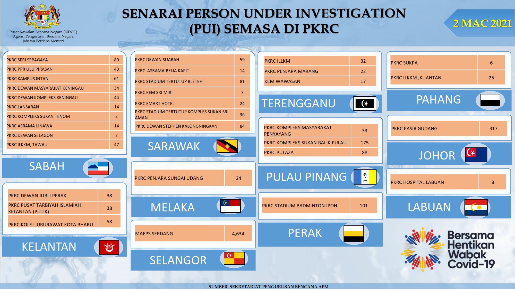 Situasi Terkini Di Pusat Kuarantin Dan Rawatan Covid-19 Berisiko Rendah 02/03/2021 Aiman Siaran Media 02 Mac 2021 Jumlah paparan: 994 Rating: ( 0 Rating ) Sila beri kadar Undi 1 Undi 2 Undi 3 Undi 4 Undi 5 Lihat / Muat Turun PDF Facebook Twitter Seterusnya Seterusnya