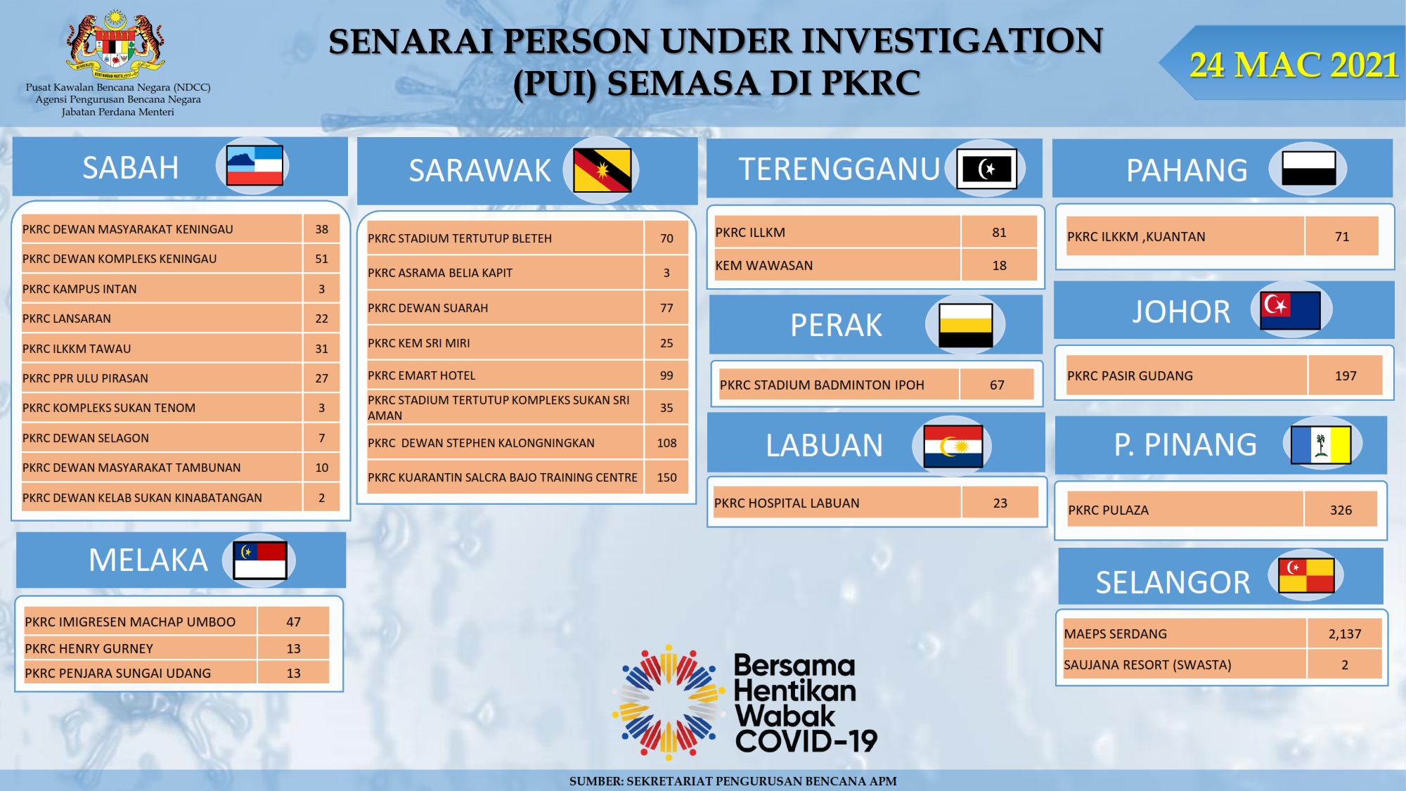 Situasi Terkini Di Pusat Kuarantin Dan Rawatan Covid-19 Berisiko Rendah 24/03/2021 Afrina Siaran Media 24 Mac 2021 Jumlah paparan: 1232 Rating: ( 0 Rating ) Sila beri kadar Undi 1 Undi 2 Undi 3 Undi 4 Undi 5 Lihat / Muat Turun PDF Facebook Twitter Seterusnya Seterusnya