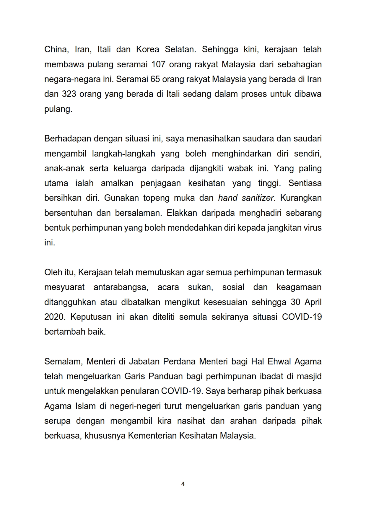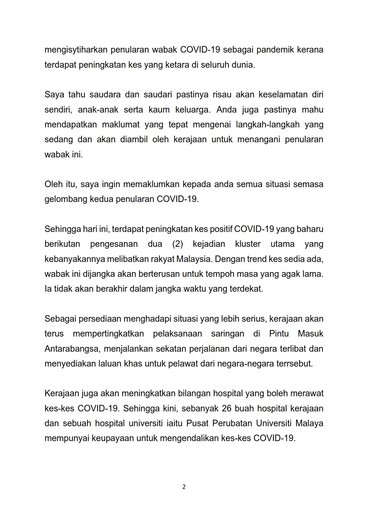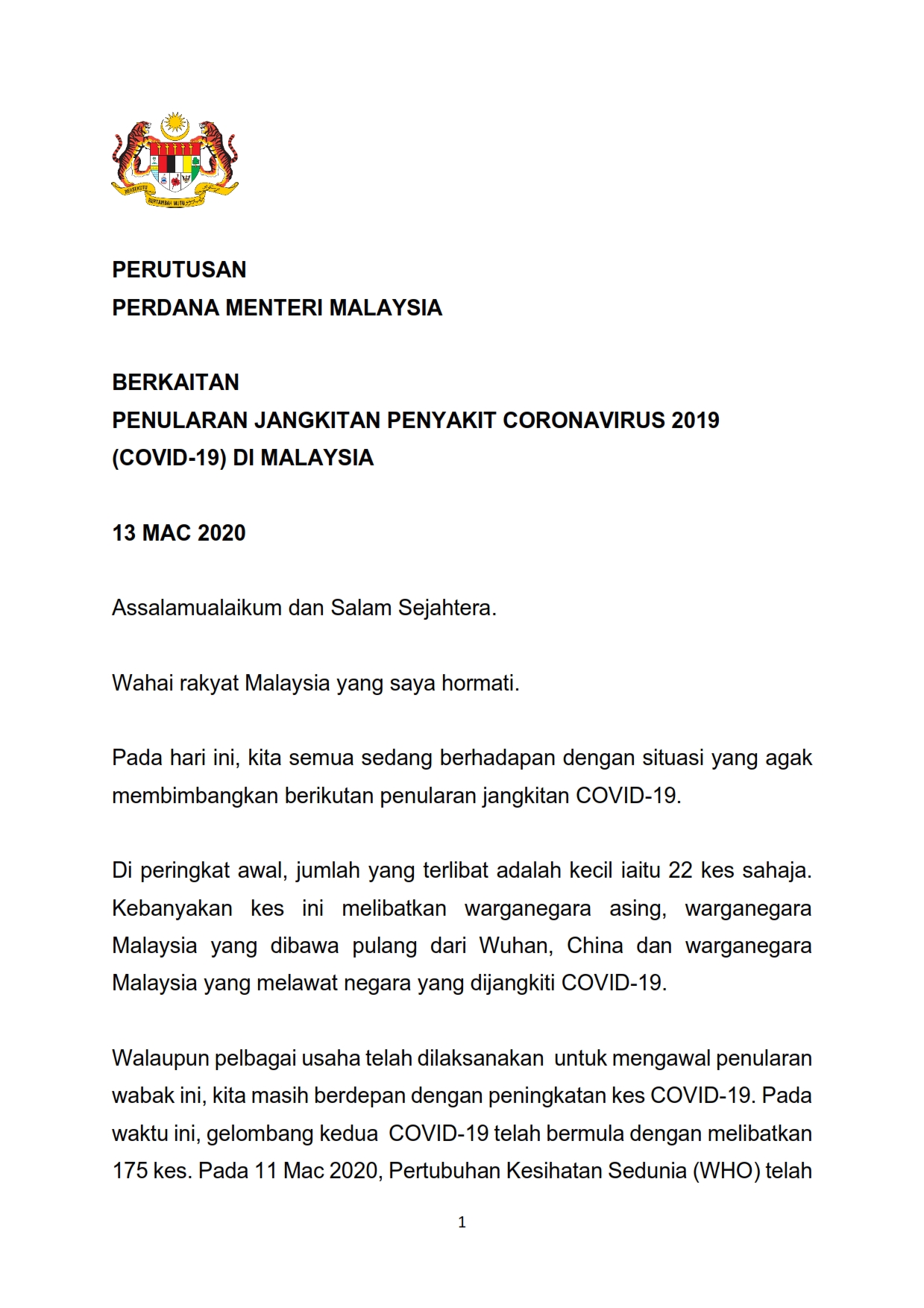 Perutusan Perdana Menteri Berkenaan COVID-19 13/03/2020 Asrul Siaran Media 13 Mac 2020 Jumlah paparan: 1304 Rating: ( 0 Rating ) Sila beri kadar Undi 1 Undi 2 Undi 3 Undi 4 Undi 5 Lihat / Muat Turun PDF Facebook Twitter Seterusnya Seterusnya