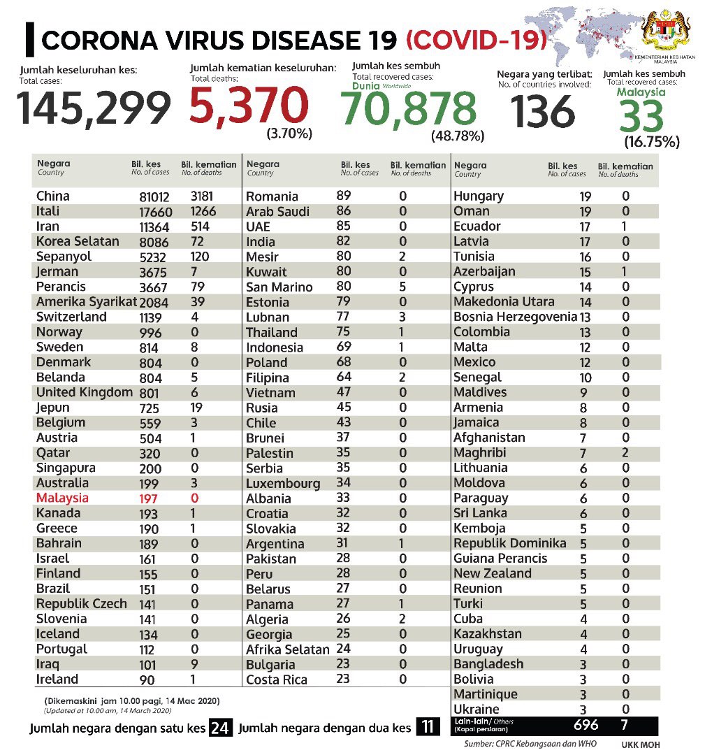 COVID-19 - Situasi Semasa 14/03/2020 1000 AM Asrul Siaran Media 14 Mac 2020 Jumlah paparan: 719 Rating: ( 0 Rating ) Sila beri kadar Undi 1 Undi 2 Undi 3 Undi 4 Undi 5 Lihat / Muat Turun JPG Facebook Twitter Seterusnya Seterusnya