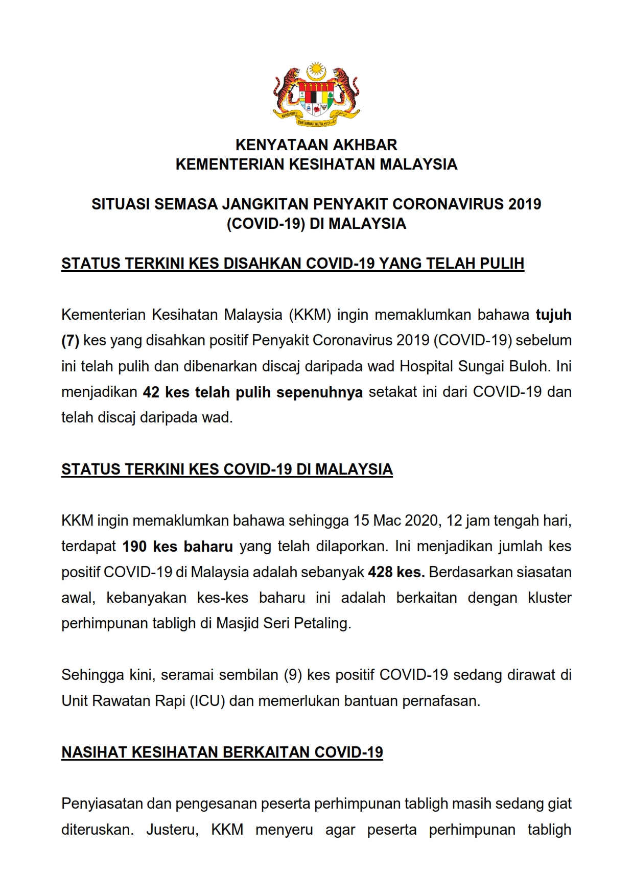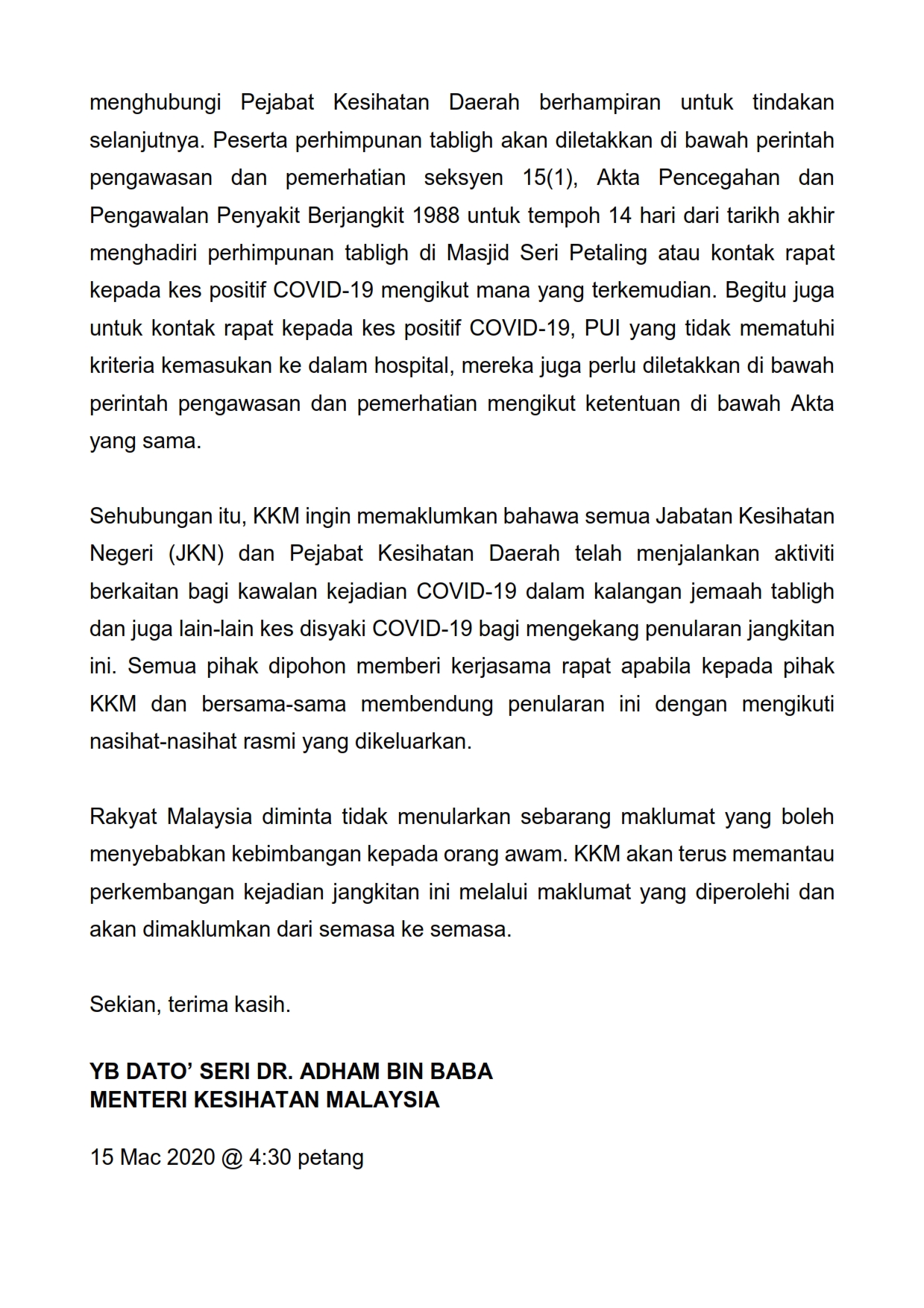 Kenyataan Akhbar Menteri Kesihatan 15/03/2020 0430 PM Asrul Siaran Media 15 Mac 2020 Jumlah paparan: 944 Rating: ( 0 Rating ) Sila beri kadar Undi 1 Undi 2 Undi 3 Undi 4 Undi 5 Lihat / Muat Turun PDF Facebook Twitter Seterusnya Seterusnya
