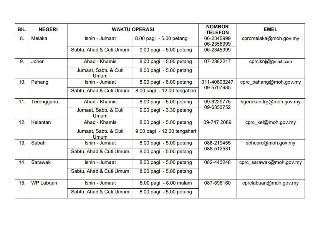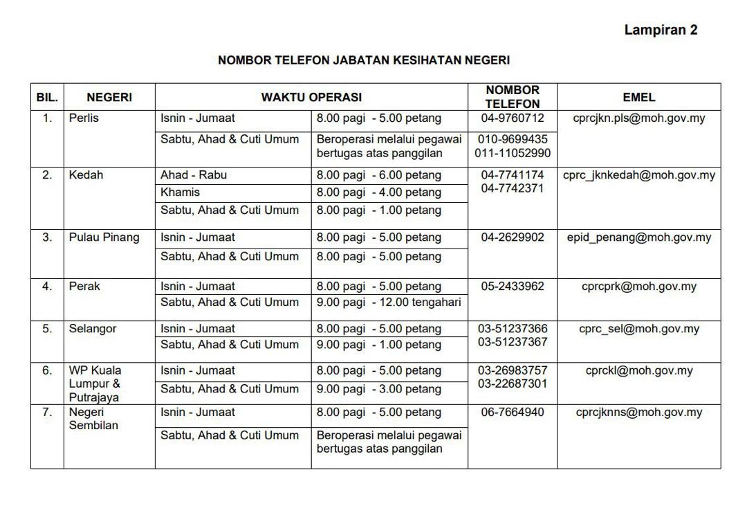 COVID-19 - Nombor Telefon Jabatan Kesihatan Negeri Asrul Nasihat 15 Mac 2020 Jumlah paparan: 1864 Rating: ( 0 Rating ) Sila beri kadar Undi 1 Undi 2 Undi 3 Undi 4 Undi 5 Lihat / Muat Turun JPG 1 Lihat / Muat Turun JPG 2 Facebook Twitter Seterusnya Seterusnya