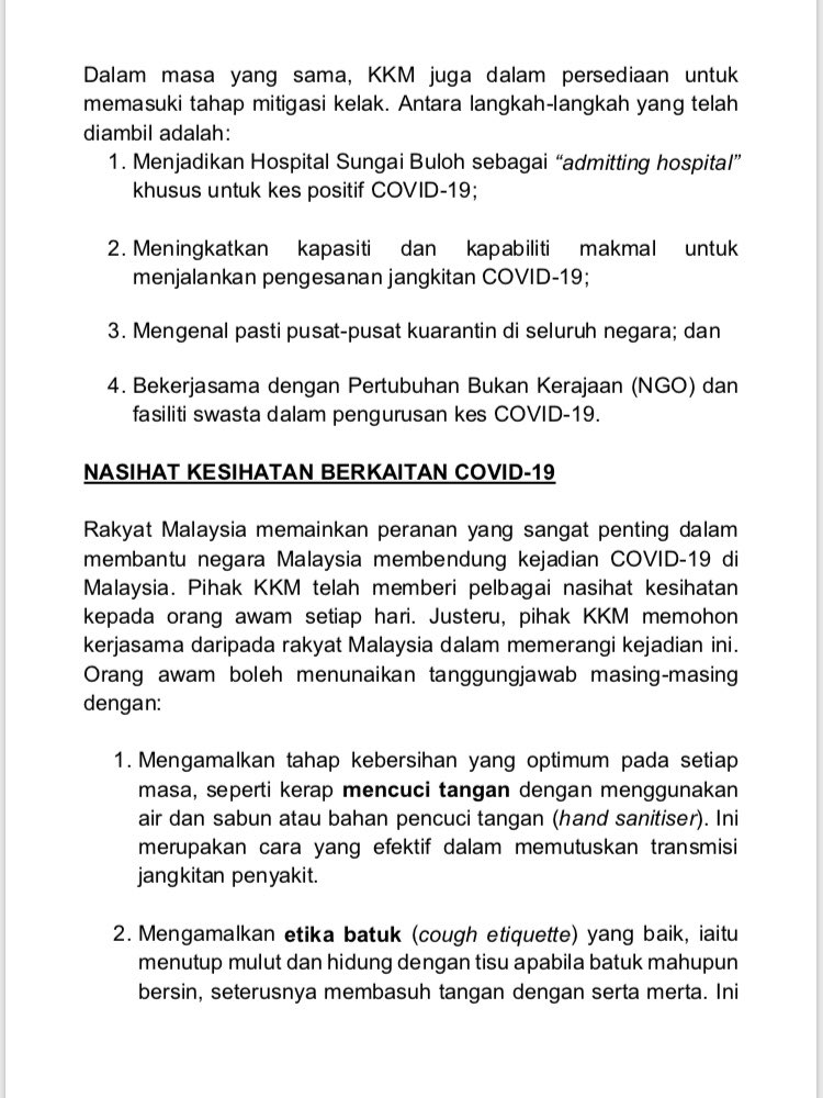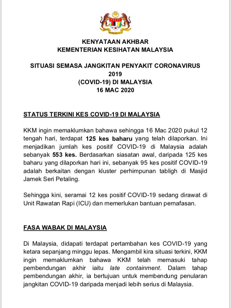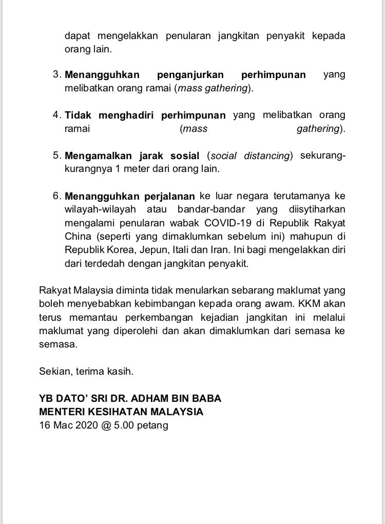 Kenyataan Akhbar Menteri Kesihatan Malaysia 16/03/2020 0500 PM Asrul Siaran Media 16 Mac 2020 Jumlah paparan: 981 Rating: ( 0 Rating ) Sila beri kadar Undi 1 Undi 2 Undi 3 Undi 4 Undi 5 Lihat / Muat Turun JPG 1 Lihat / Muat Turun JPG 2 Lihat / Muat Turun JPG 3 Facebook Twitter Seterusnya Seterusnya