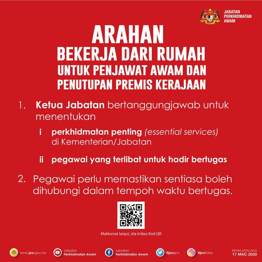 COVID-19 - Arahan Bekerja Dari Rumah Untuk Penjawat Awam & Penutupan Premis Kerajaan 17/03/2020 Asrul Nasihat 17 Mac 2020 Jumlah paparan: 893 Rating: ( 0 Rating ) Sila beri kadar Undi 1 Undi 2 Undi 3 Undi 4 Undi 5 Lihat / Muat Turun JPG Facebook Twitter Seterusnya Seterusnya