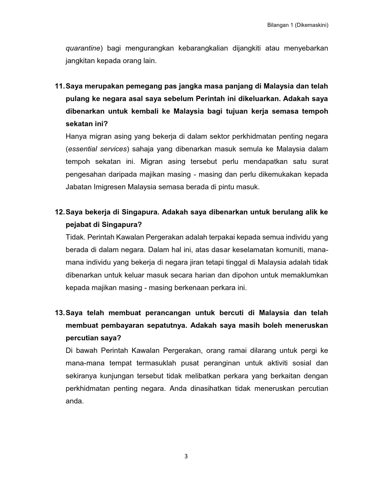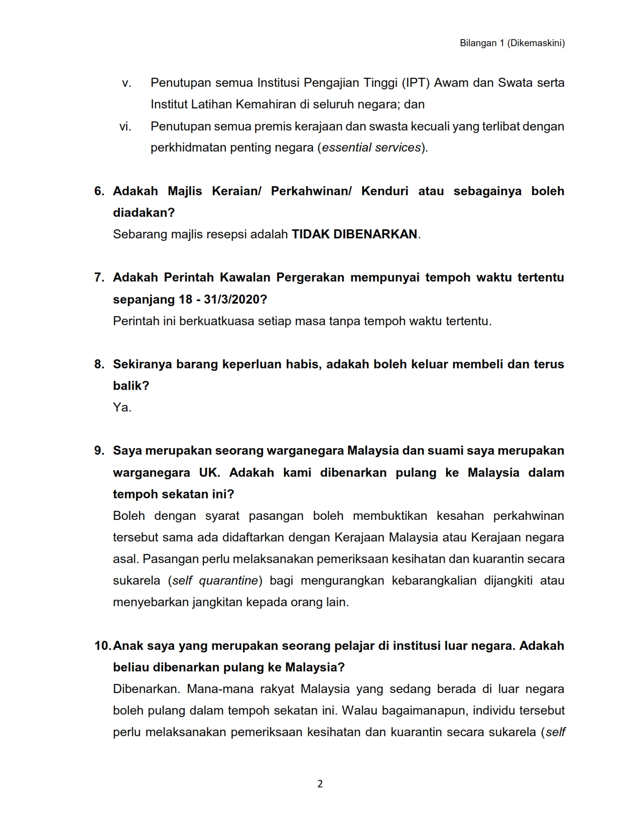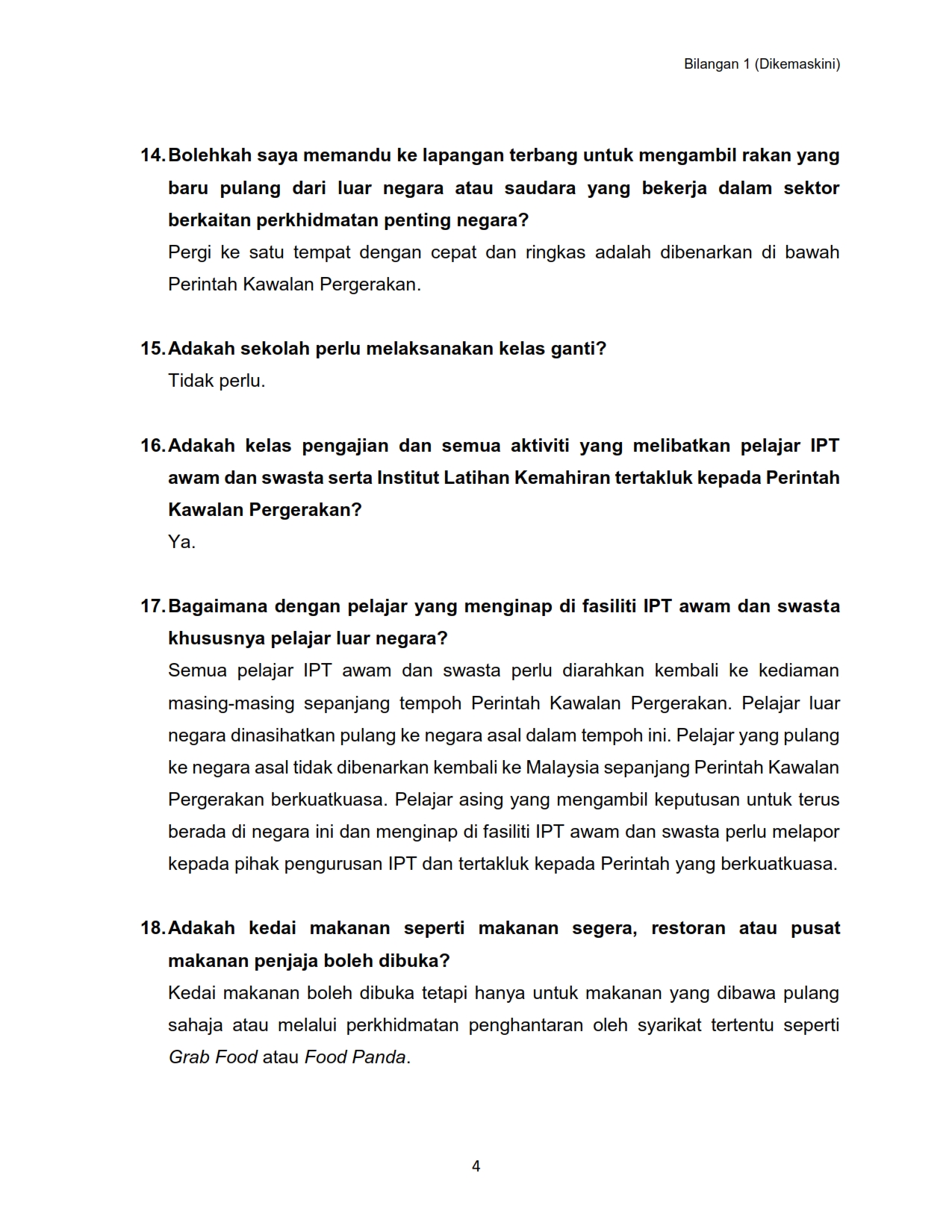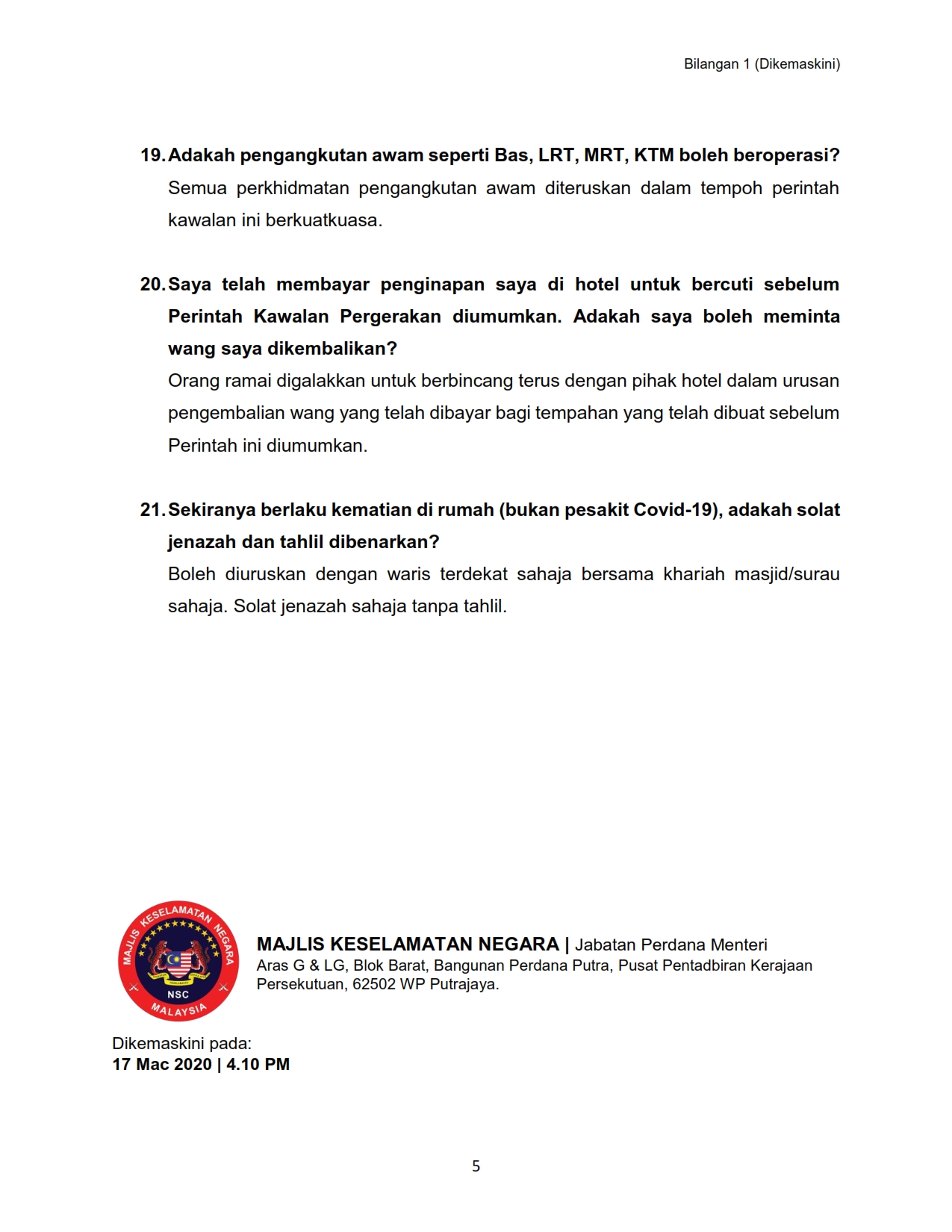 FAQ Perintah Sekatan Pergerakan - Bil. 1 (Dikemaskini) 17/03/2020 Aiman FAQ 17 Mac 2020 Jumlah paparan: 989 Rating: ( 0 Rating ) Sila beri kadar Undi 1 Undi 2 Undi 3 Undi 4 Undi 5 Lihat / Muat Turun PDF Muat Turun JPG 1 Muat Turun JPG 2 Facebook Twitter Seterusnya