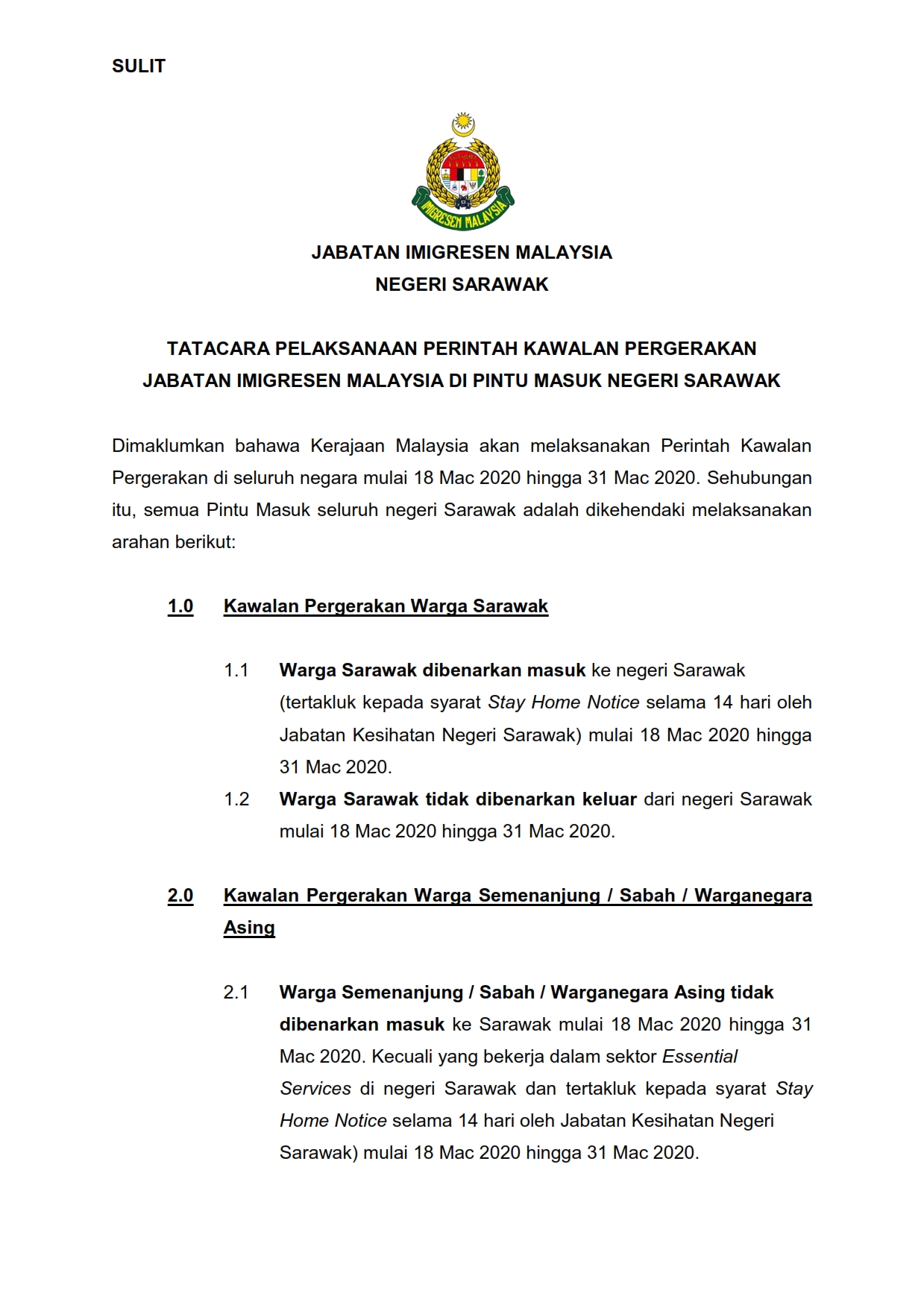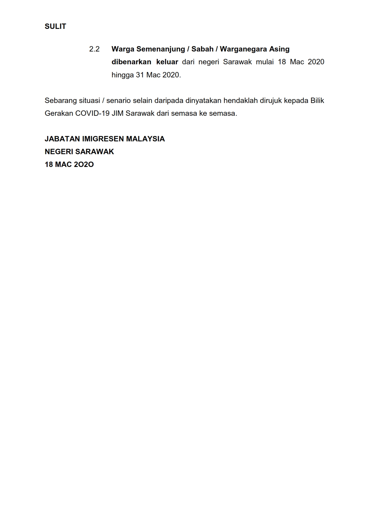 Kenyataan Media Jabatan Imigresen Malaysia Negeri Sarawak 18/03/2020 Aiman Siaran Media 18 Mac 2020 Jumlah paparan: 1008 Rating: ( 0 Rating ) Sila beri kadar Undi 1 Undi 2 Undi 3 Undi 4 Undi 5 Lihat / Muat Turun PDF Muat Turun JPG 1 Muat Turun JPG 2 Facebook Twitter Seterusnya Seterusnya