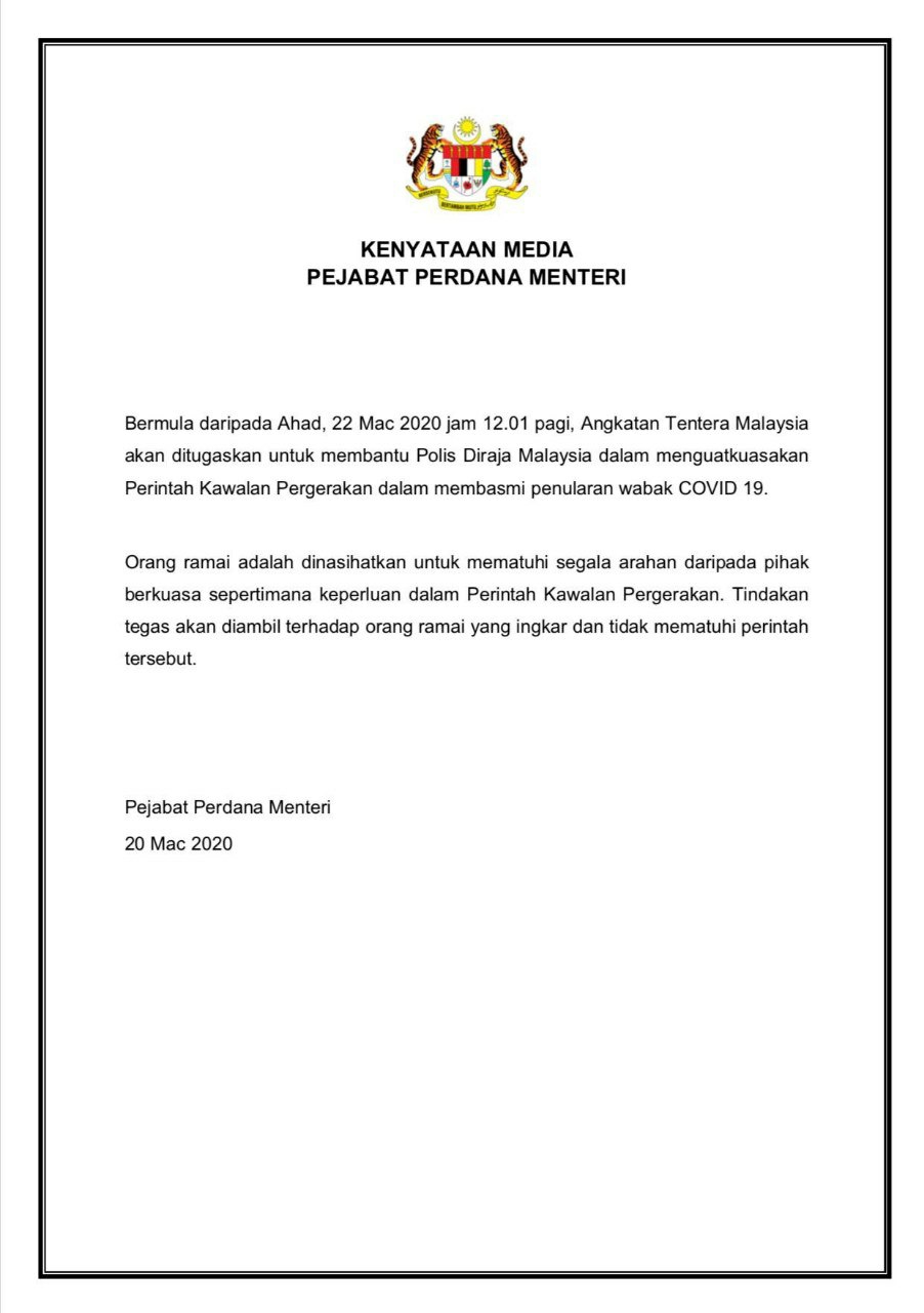 Kenyataan Media Pejabat Perdana Menteri 20/03/2020 Asrul Siaran Media 20 Mac 2020 Jumlah paparan: 649 Rating: ( 0 Rating ) Sila beri kadar Undi 1 Undi 2 Undi 3 Undi 4 Undi 5 Lihat / Muat Turun JPG Facebook Twitter Seterusnya Seterusnya