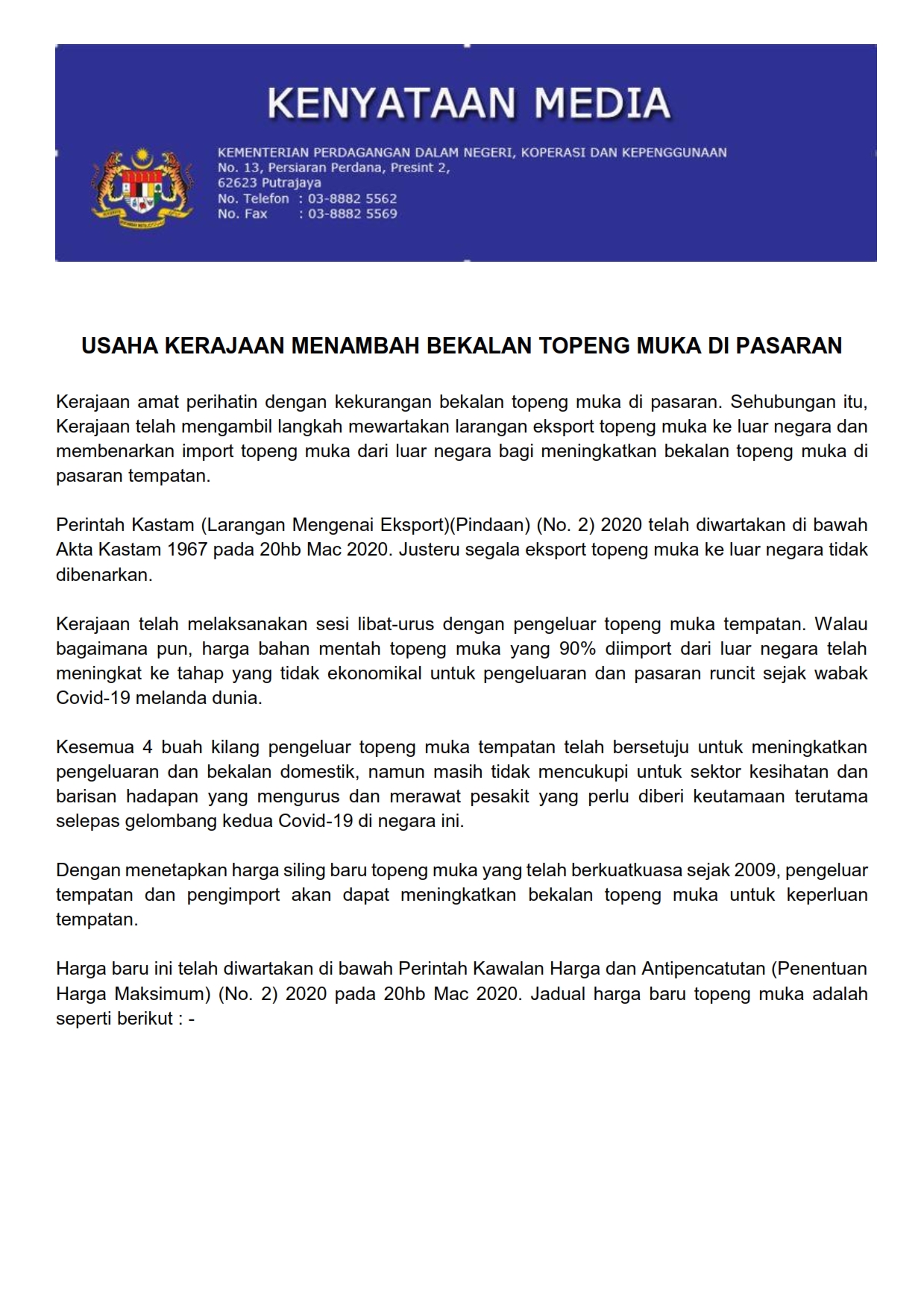 Kenyataan Media KPDNKK 20/03/2020 Aiman Siaran Media 20 Mac 2020 Jumlah paparan: 963 Rating: ( 0 Rating ) Sila beri kadar Undi 1 Undi 2 Undi 3 Undi 4 Undi 5 Lihat / Muat Turun PDF Lihat / Muat Turun JPG 1 Lihat / Muat Turun JPG 2 Facebook Twitter Seterusnya Seterusnya