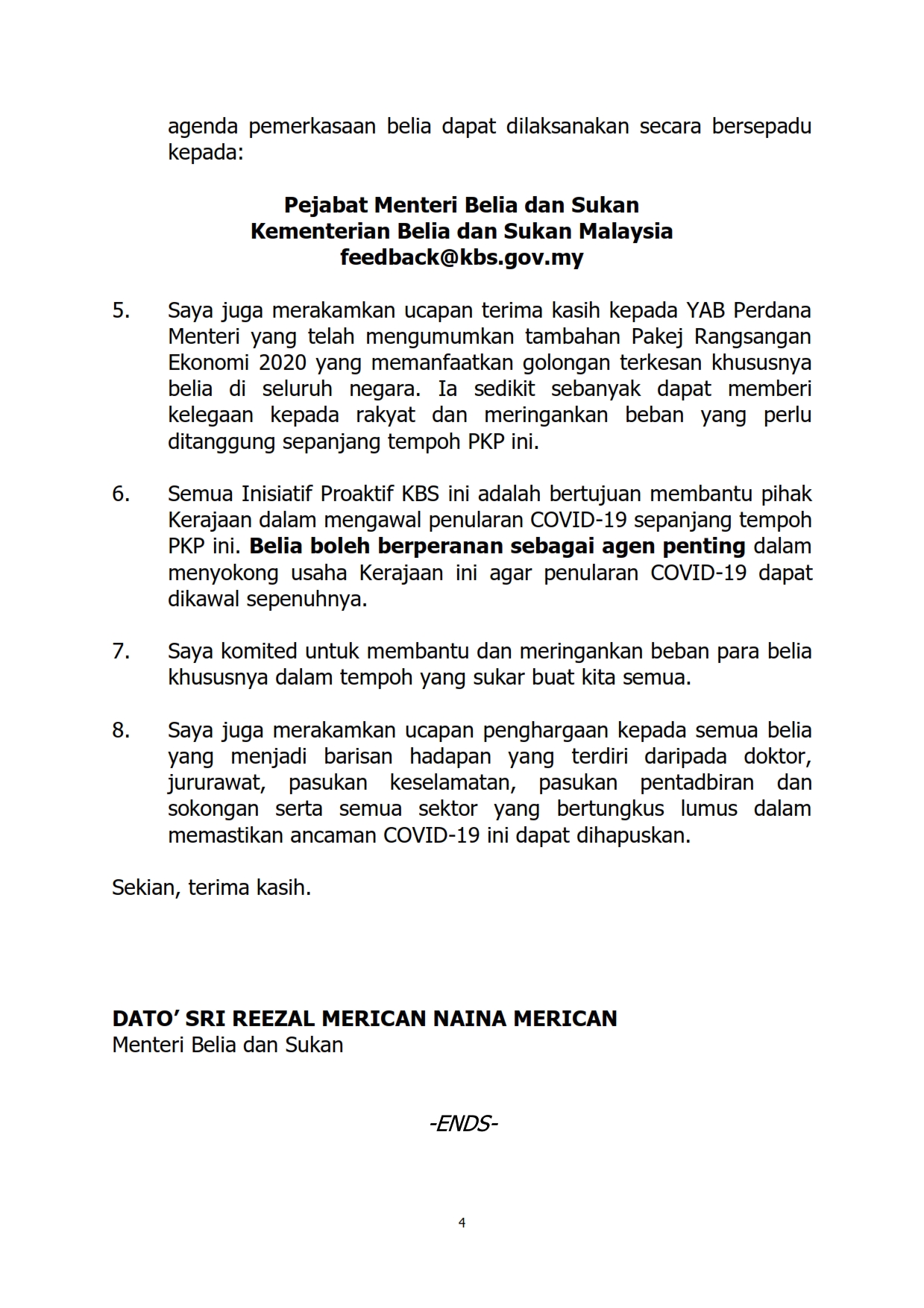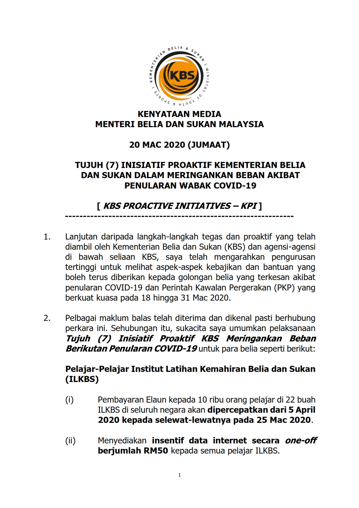 Kenyataan Media Kementerian Belia Dan Sukan 20/03/2020 Aiman Siaran Media 20 Mac 2020 Jumlah paparan: 1007 Rating: ( 0 Rating ) Sila beri kadar Undi 1 Undi 2 Undi 3 Undi 4 Undi 5 Lihat / Muat Turun PDF Facebook Twitter Seterusnya Seterusnya