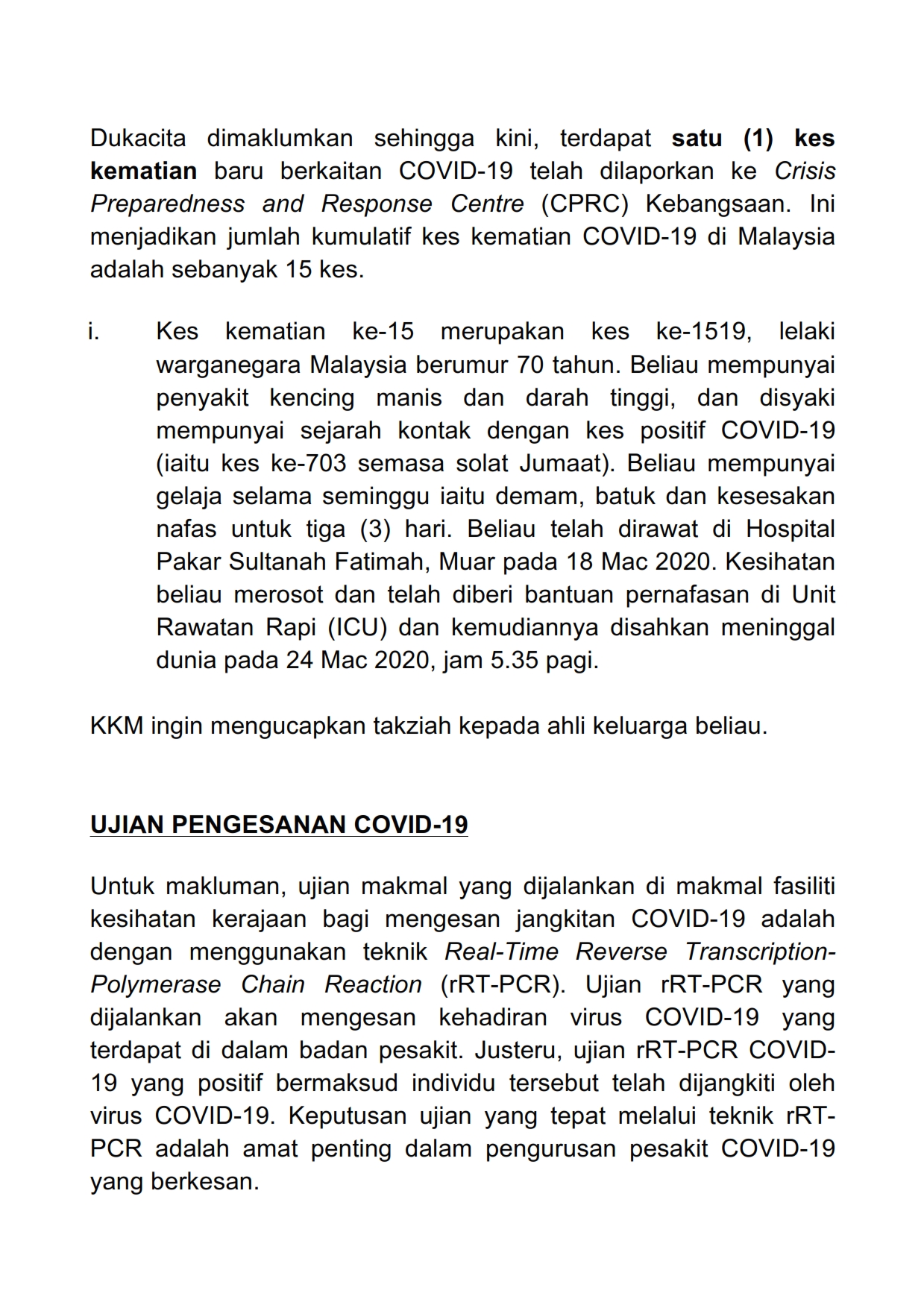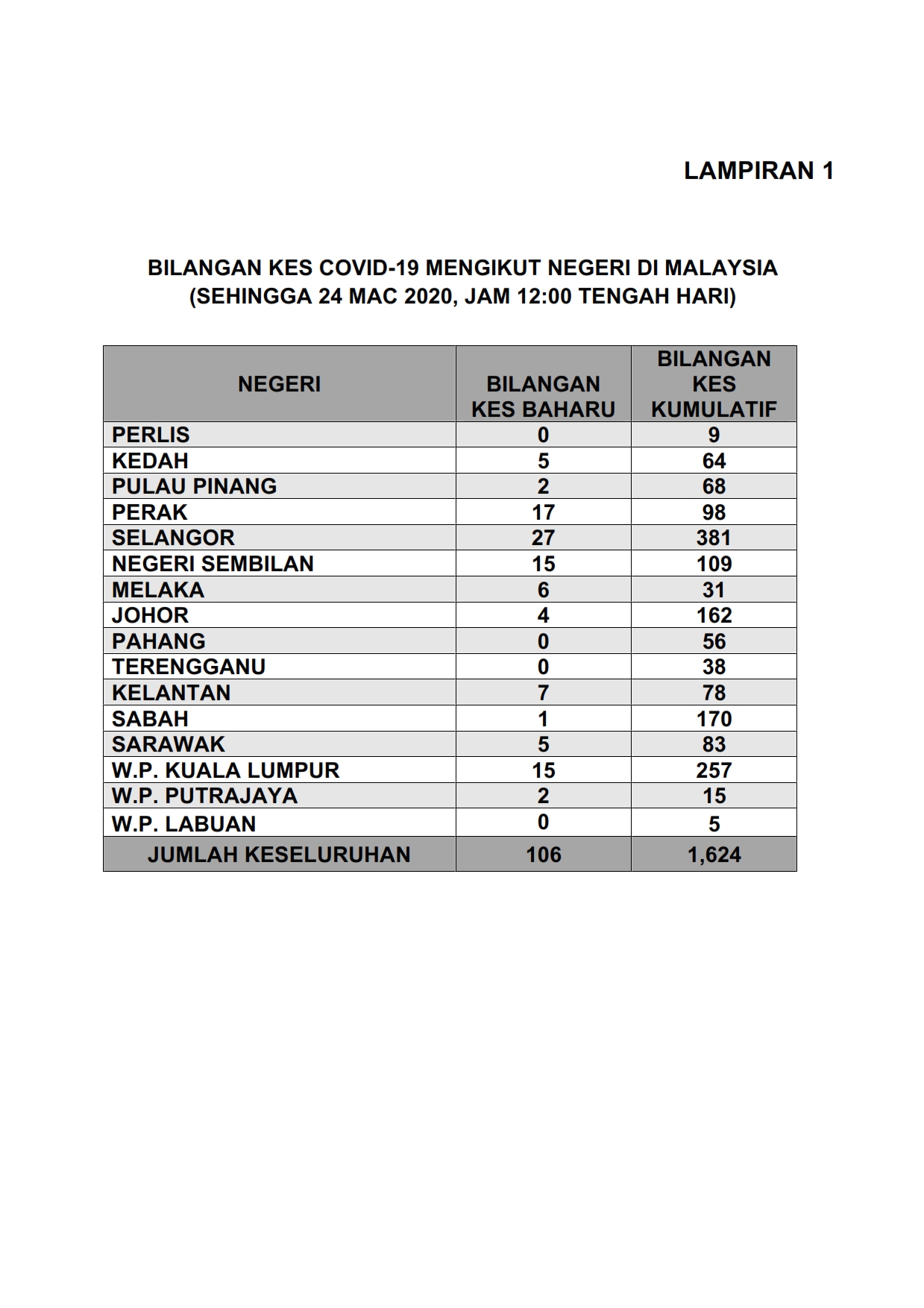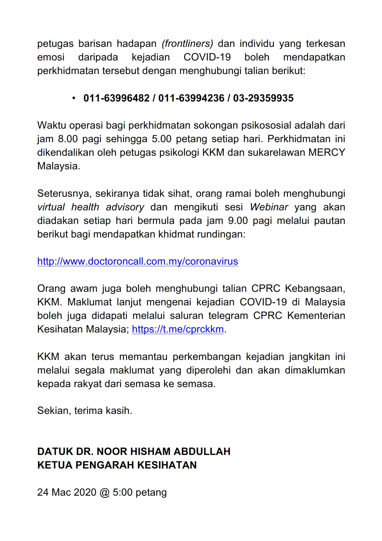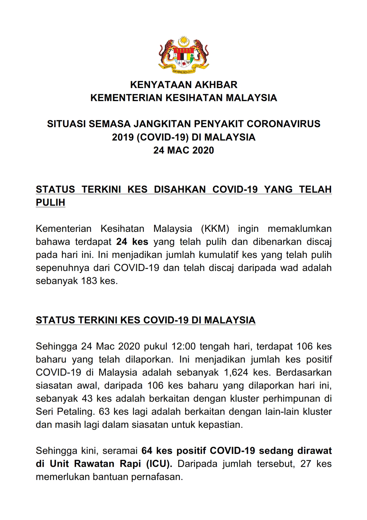 Kenyataan Akhbar KP KKM 24/03/2020 0500PM Aiman Siaran Media 24 Mac 2020 Jumlah paparan: 1063 Rating: ( 0 Rating ) Sila beri kadar Undi 1 Undi 2 Undi 3 Undi 4 Undi 5 /bencana2/images/ndcc/documents/covid19/siaranmedia/SIARAN_MEDIA_20200324_02.pdf Facebook Twitter Seterusnya Seterusnya