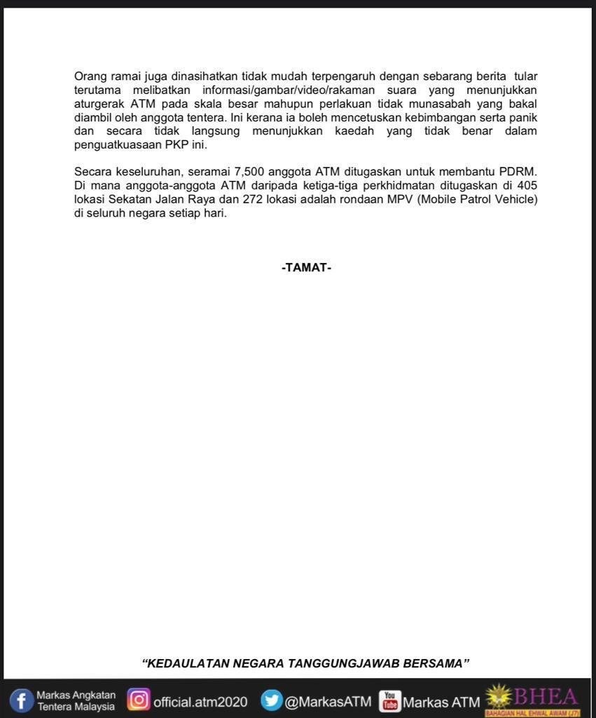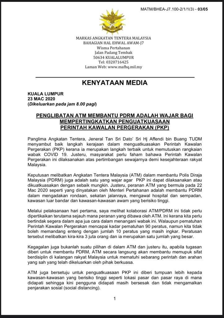Kenyataan Media Angkatan Tentera Malaysia (ATM) 23/03/2020 Asrul Siaran Media 23 Mac 2020 Jumlah paparan: 710 Rating: ( 0 Rating ) Sila beri kadar Undi 1 Undi 2 Undi 3 Undi 4 Undi 5 Facebook Twitter Seterusnya Seterusnya