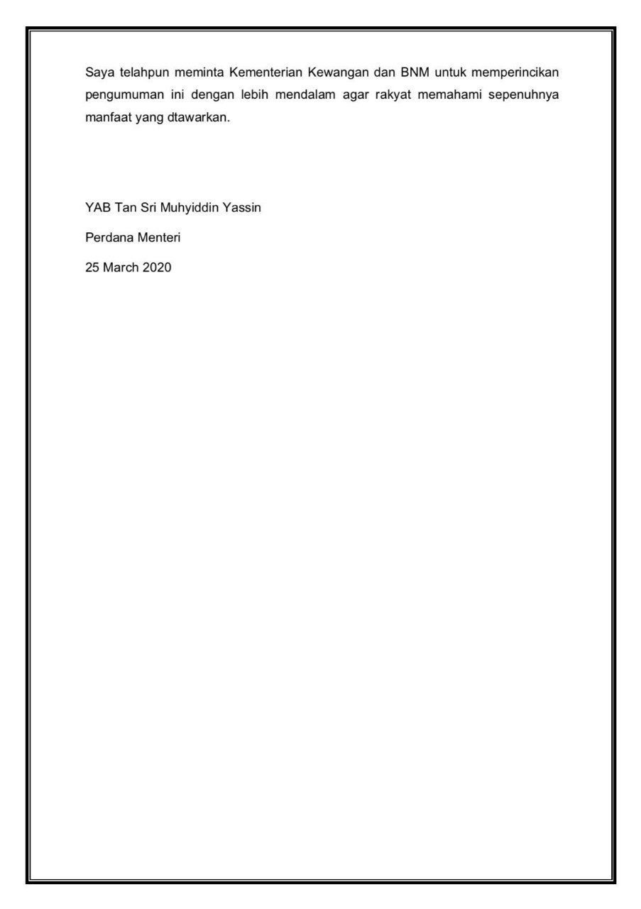 Kenyataan Media YAB Perdana Menteri Malaysia 25/03/2020 Asrul Siaran Media 25 Mac 2020 Jumlah paparan: 1170 Rating: ( 0 Rating ) Sila beri kadar Undi 1 Undi 2 Undi 3 Undi 4 Undi 5 Facebook Twitter Seterusnya Seterusnya