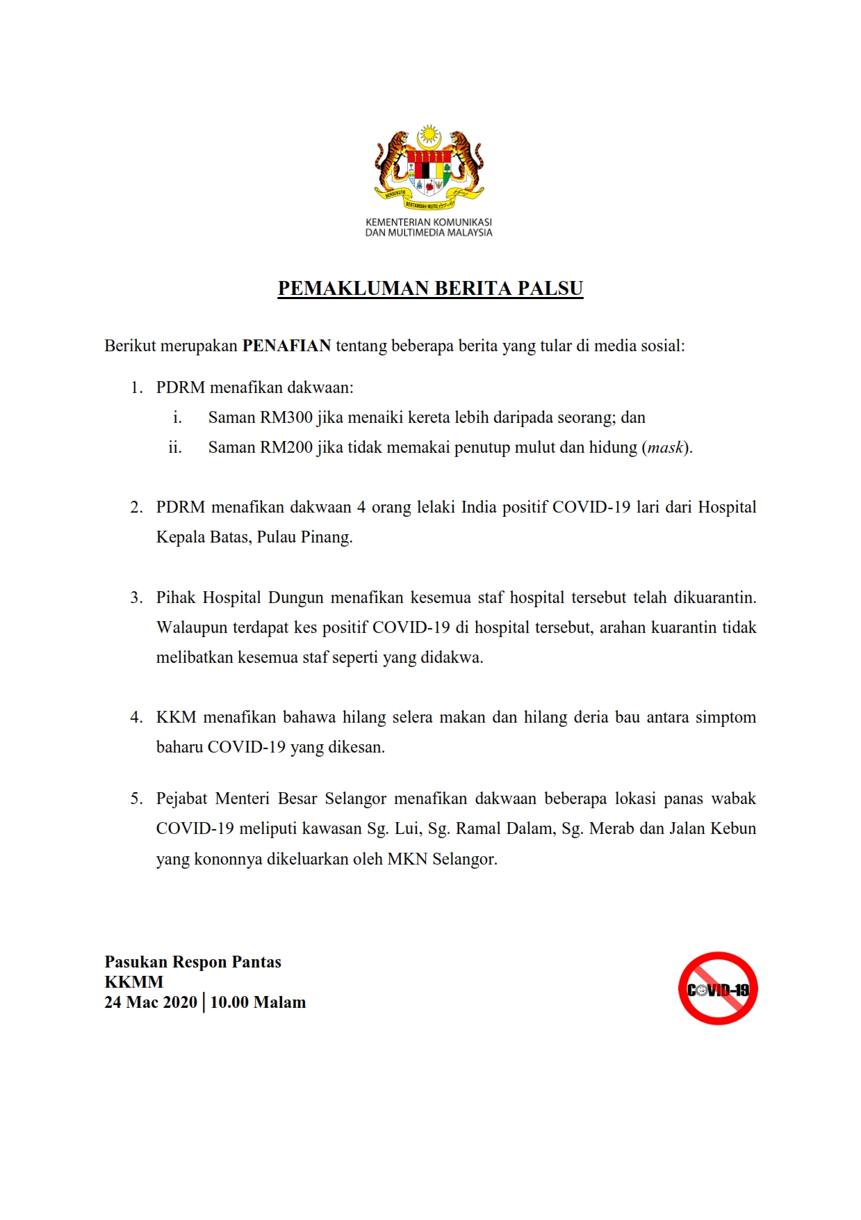 Kenyataan Media SKMM - Pemakluman Berita Palsu 25/03/2020 Asrul Siaran Media 25 Mac 2020 Jumlah paparan: 1126 Rating: ( 0 Rating ) Sila beri kadar Undi 1 Undi 2 Undi 3 Undi 4 Undi 5 /bencana2/images/ndcc/documents/covid19/siaranmedia/SIARAN_MEDIA_KKM_20200325_05.pdf Facebook Twitter Seterusnya Seterusnya