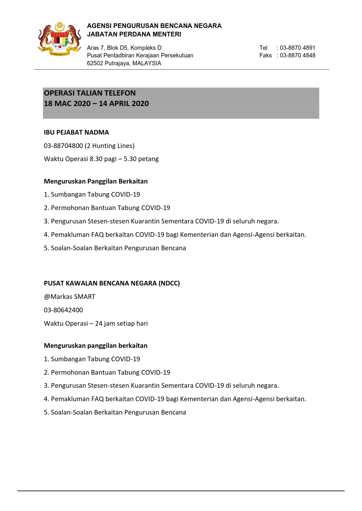 Soalan Lazim FAQ Berkaitan Operasi Talian Telefon NADMA 25/03/2020 Aiman FAQ 25 Mac 2020 Jumlah paparan: 2123 Rating: ( 0 Rating ) Sila beri kadar Undi 1 Undi 2 Undi 3 Undi 4 Undi 5 /bencana2/images/ndcc/documents/covid19/faq/SIARAN_MEDIA_KKM_20200325_02.pdf Facebook Twitter Seterusnya Seterusnya